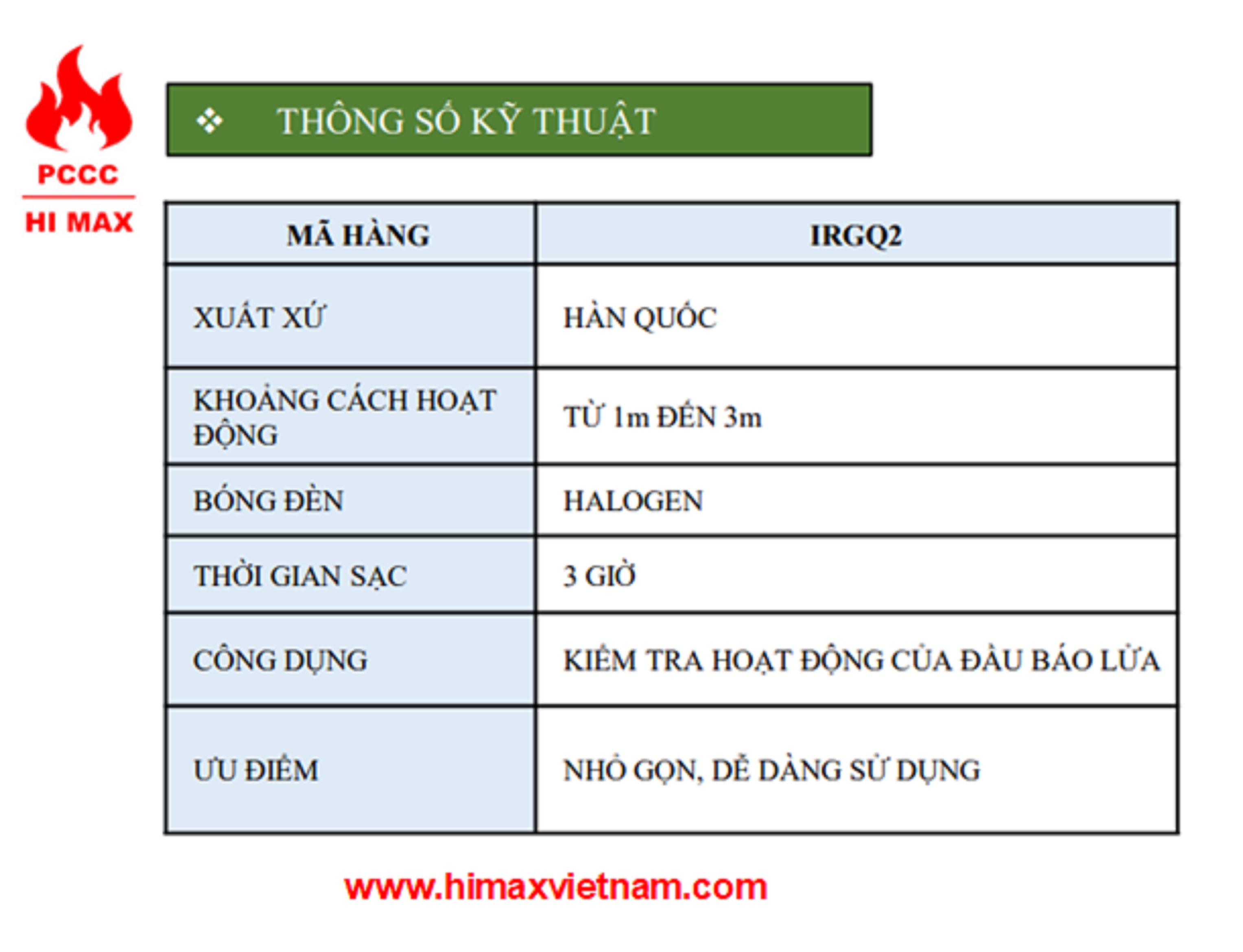 MÃ HÀNG: IRGQ2 XUẤT XỨ: HÀN QUỐC KHOẢNG CÁCH HOẠT ĐỘNG: TỪ 1m ĐẾN 3m BÓNG ĐÈN: HALOGEN THỜI GIAN SẠC: 3 GIỜ CÔNG DỤNG: KIỂM TRA HOẠT ĐỘNG CỦA ĐẦU BÁO LỬA ƯU ĐIỂM: NHỎ GỌN, DỄ DÀNG SỬ DỤNG