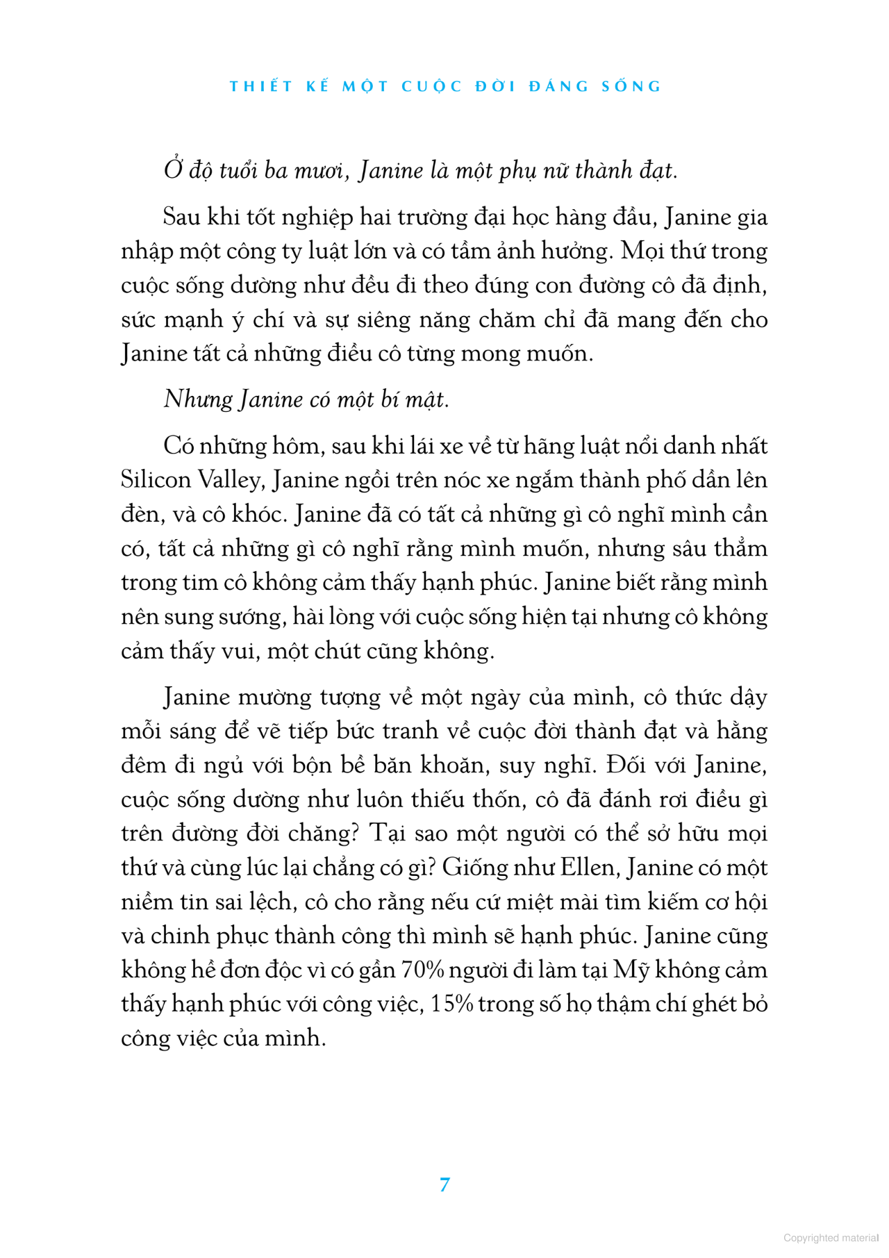 Đọc "Thiết kế một cuộc đời đáng sống", bạn đọc sẽ gặp những người trẻ lạc lối, những nhân vật "chưa biết phải làm gì với cuộc đời mình", những con người tài giỏi nhưng gặp khủng hoảng trong sự nghiệp, cuộc số Với mỗi câu chuyện và vấn đề, các tác giả ứng dụng phương pháp tư duy thiết kế để giải quyết, từ đó bạn sẽ học được cách áp dụng kiểu tư duy này vào giải quyết vấn đề của chính mình.