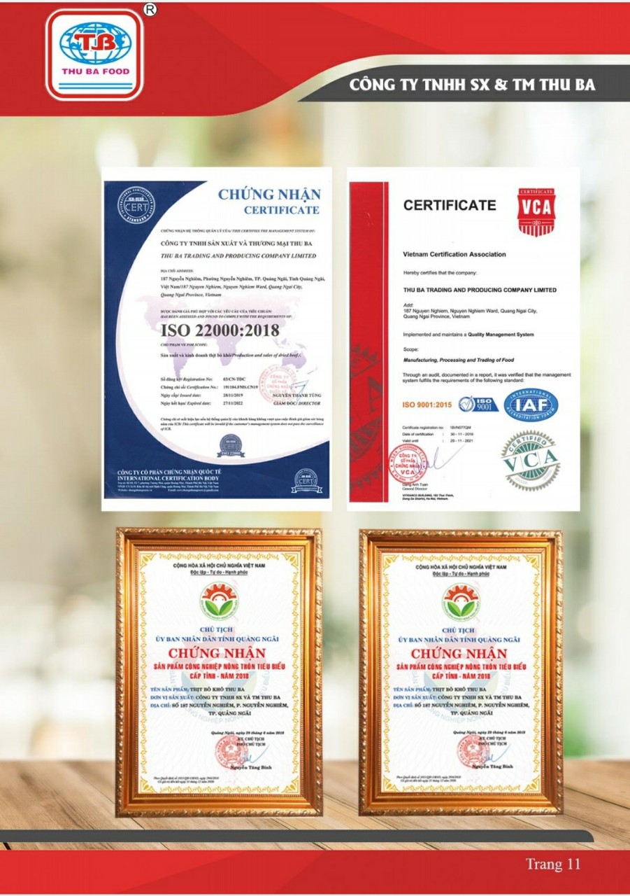 BÒ KHÔ THU BA là món đặc sản Quảng Ngãi, đạt tiêu chuẩn ISO 22000 và là Hàng Việt Nam Chất Lượng Cao do Người tiêu dùng bình chọn từ 2017 đến 2024 Sản phẩm được sản
