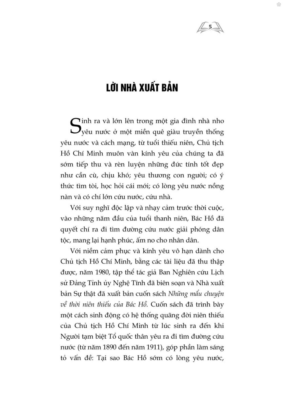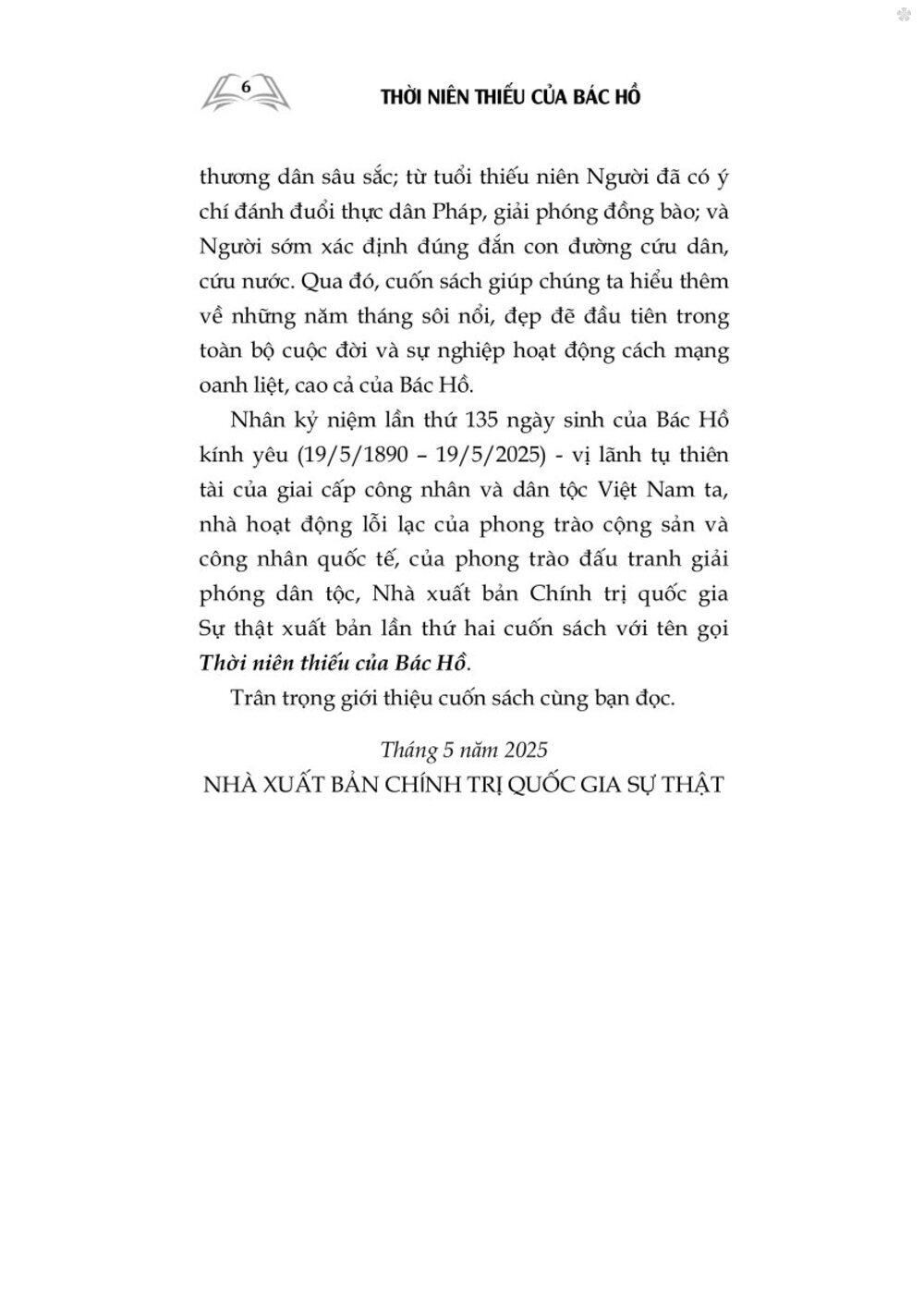 Nhân Kỷ niệm lần thứ 135 ngày sinh của Bác Hồ kính yêu (19/5/1890 – 19/5/2025) - Vị lãnh tụ thiên tài của giai cấp công nhân và dân tộc Việt Nam ta, nhà hoạt động lỗi lạc của phong trào cộng sản và công nhân quốc tế, của phong trào đấu tranh giải phóng dân tộc, Nhà xuất bản Chính trị quốc gia Sự thật xuất bản lần thứ hai cuốn sách với tên gọi Thời niên thiếu của Bác Hồ. Trân trọng giới thiệu cuốn sách cùng bạn đọc