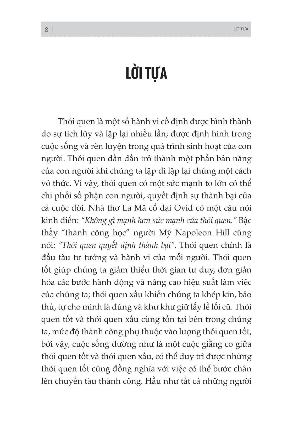 Cuốn sách sẽ đưa bạn khám phá cách phát triển và duy trì những thói quen tích cực có thể dẫn đến một cuộc sống trọn vẹn và ý nghĩa hơn. Bạn sẽ học được cách giữ vững niềm tin, cải thiện các mối quan hệ, thay đổi cách nghĩ và hành động của m.ình. Bạn sẽ tìm thấy trong cuốn sách những phương pháp cụ thể và chi tiết để thay đổi các thói quen tiêu cực thành thói quen tích cực. Từ việc tăng cường hiệu suất làm việc, xây dựng mối quan hệ tốt đẹp đến tận hưởng cuộc sống cân bằng hơn, cuốn sách sẽ giúp bạn thực hiện những thay đổi nhỏ nhưng quan trọng để dẫn dắt bạn đến những thành công lớn
