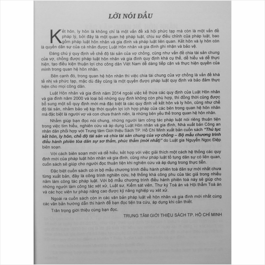 Nhà sách Nam Việt – Namvietbook xin trân trọng giới thiệu cuốn sách: THỦ TỤC KẾT HÔN, LY HÔN, CHẾ ĐỘ TÀI SẢN VÀ CHIA TÀI SẢN CHUNG CỦA VỢ CHỒNG - BỘ MẪU CHƯƠNG TRÌNH ĐIỀU HÀNH PHIÊN TÒA DÂN SỰ SƠ THẨM, PHÚC THẨM (Mới Nhất) Sách THỦ TỤC KẾT HÔN, LY HÔN, CHẾ ĐỘ TÀI SẢN VÀ CHIA TÀI SẢN CHUNG CỦA VỢ CHỒNG - BỘ MẪU CHƯƠNG TRÌNH ĐIỀU HÀNH PHIÊN TÒA DÂN SỰ SƠ THẨM, PHÚC THẨM (Mới Nhất)
