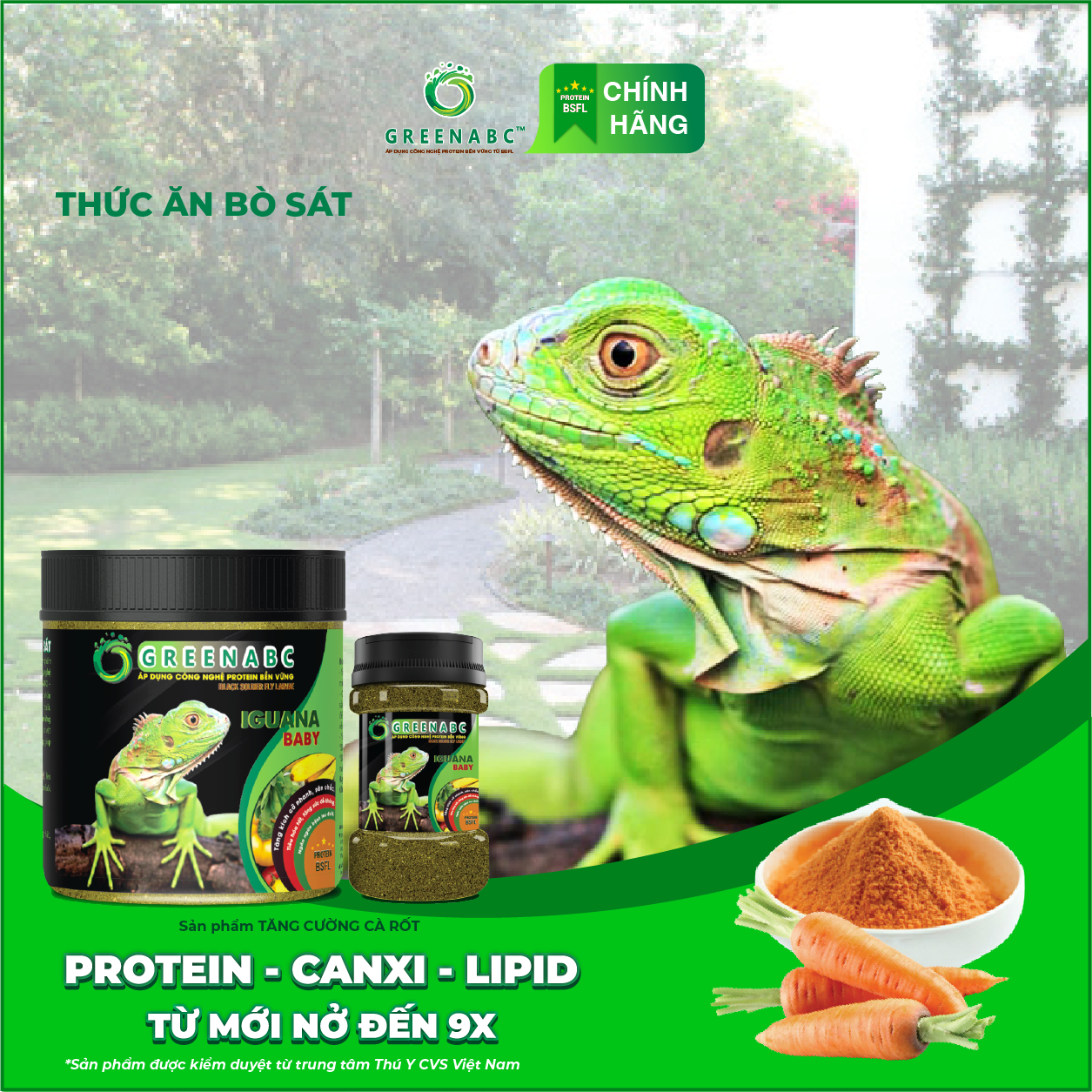 GREENABC - THỨC ĂN IGUANA BABY VỊ CÀ RỐT- Rồng Nam Mỹ Baby từ mới nở đến 9x.  GREENABC là thức ăn cao cấp dành cho Iguana Baby - Rồng Nam Mỹ Baby Đặc biệt sản phẩm GREENABC được sản xuất theo phương pháp Áp dụng công nghệ PROTEIN bền vững từ bột đạm G.Meal rất giàu PROTEIN – CANXI – LIPID có trong BSFL, đã được Mỹ (AAFCO) và EU chấp nhận đưa vào công thức cho ngành sản xuất thức ăn dành cho vật nuôi. Sản phẩm GREENABC cung cấp các giá trị dinh dưỡng bền vững cho Iguana với sự kết hợp 80% thành phần có nguồn gốc thực vật và 20% thành phần có nguồn gốc động vật từ côn trùng, giúp cho Iguana Baby:      + Lột da thường xuyên, tăng kích cỡ nhanh, lên màu đẹp.      + Với hàm lượng Canxi 100% nguyên chất có trong BSFL giúp gai bung, đều, ngăn ngừa các bệnh thường gặp như teo đuôi, MBD, sạn,      + Kích thích khứu giác, tăng cường vị giác, giúp Iguana ăn ngon miệng hơn. Đặc biệt với hương thơm tự nhiên, Greenabc kích thích khứu giác của các Iguana Abino T-, giúp các bé ăn tốt hơn.       + Tiêu hóa tốt, cơ thể hấp thụ toàn bộ dưỡng chất cần thiết, giúp cơ thể phát triển toàn diện.      + Cơ thể săn chắc, khỏe mạnh.      + Giảm thiểu mùi hôi của phân và cơ thể. IGUANA BABY có 3 loại combo giúp IGUANA phát triển toàn diện cơ thể và Quý Khách Hàng tiết kiệm chi phí Combo 1: Combo 2: Combo 3: Ghi chú: Khi sử dụng combo Iguana Baby 3, KHÔNG CẦN BỔ SUNG THÊM CANXI VÀ D3 cho Iguana, vì trong combo Iguana Baby 3 đã đầy đủ lượng Canxi cho Igu phát triển. Quý khách hàng sẽ SIÊU TIẾT KIỆM CHI PHÍ cho việc chăm sóc cho Iguana.  Thành phần dinh dưỡng và hướng dẫn sử dụng: