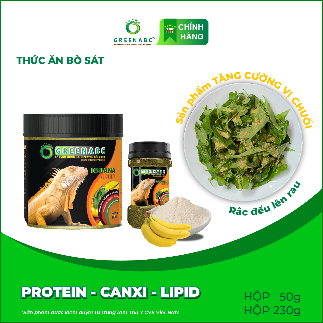 GREENABC - THỨC ĂN IGUANA TRƯỞNG THÀNH VỊ CHUÔI- Rồng Nam Mỹ trưởng thành từ 1m trở lên GREENABC là thức ăn cao cấp dành cho Iguana Trưởng Thành - Rồng Nam Mỹ Trưởng Thành. Đặc biệt sản phẩm GREENABC được sản xuất theo phương pháp Áp dụng công nghệ PROTEIN bền vững từ bột đạm G.Meal rất giàu PROTEIN – CANXI – LIPID có trong BSFL, đã được Mỹ (AAFCO) và EU chấp nhận đưa vào công thức cho ngành sản xuất thức ăn dành cho vật nuôi. Sản phẩm GREENABC cung cấp các giá trị dinh dưỡng bền vững cho Iguana với sự kết hợp 90% thành phần có nguồn gốc thực vật và 10% thành phần có nguồn gốc động vật từ côn trùng, giúp cho Iguana: