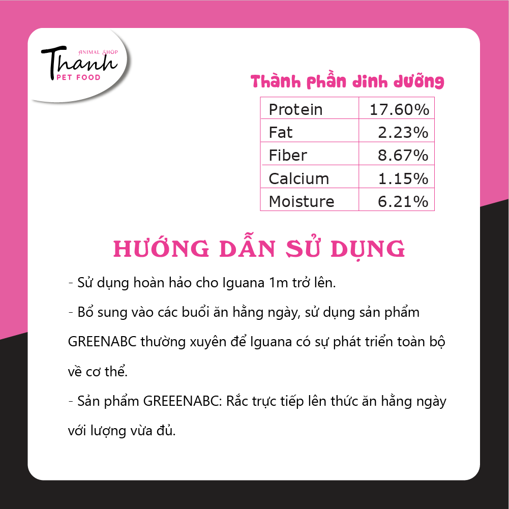 THỨC ĂN BÒ SÁT - BỔ SUNG DINH DƯỠNG PROTEIN, CANXI, LIPID GREENABC là thức ăn cao cấp dành cho các loại bò sát: IGUANA, BEARDED DRAGON, LEOPARD GECKO. Đặc biệt sản phẩm GREENABC được