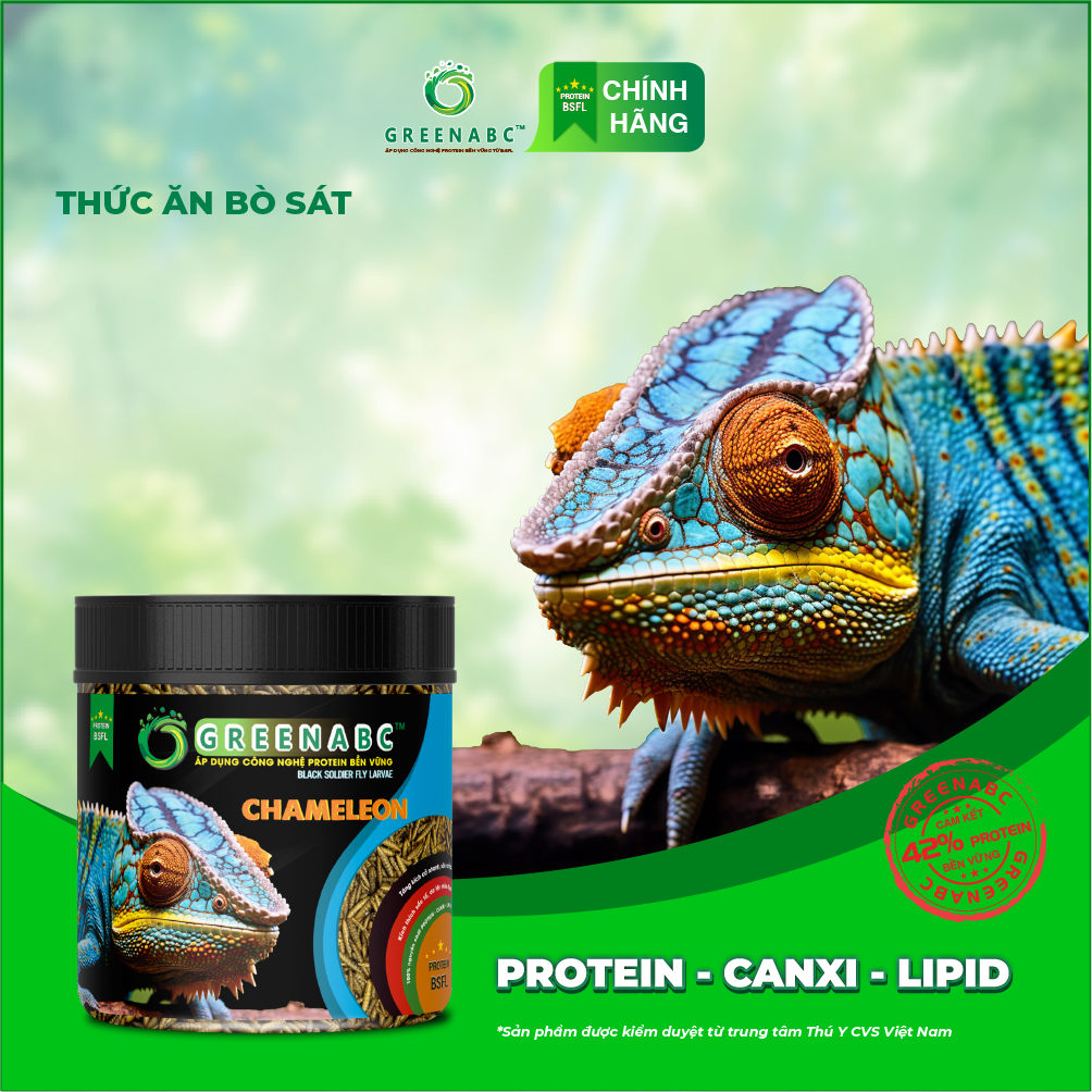 THỨC ĂN TẮC KÈ HOA CHAMELEON - BỔ SUNG DINH DƯỠNG PROTEIN 44.9%, CANXI 1.33%, LIPID 20.1% Sản phẩm GREENABC cung cấp các giá trị dinh dưỡng bền vững cho thú cưng, giúp cho