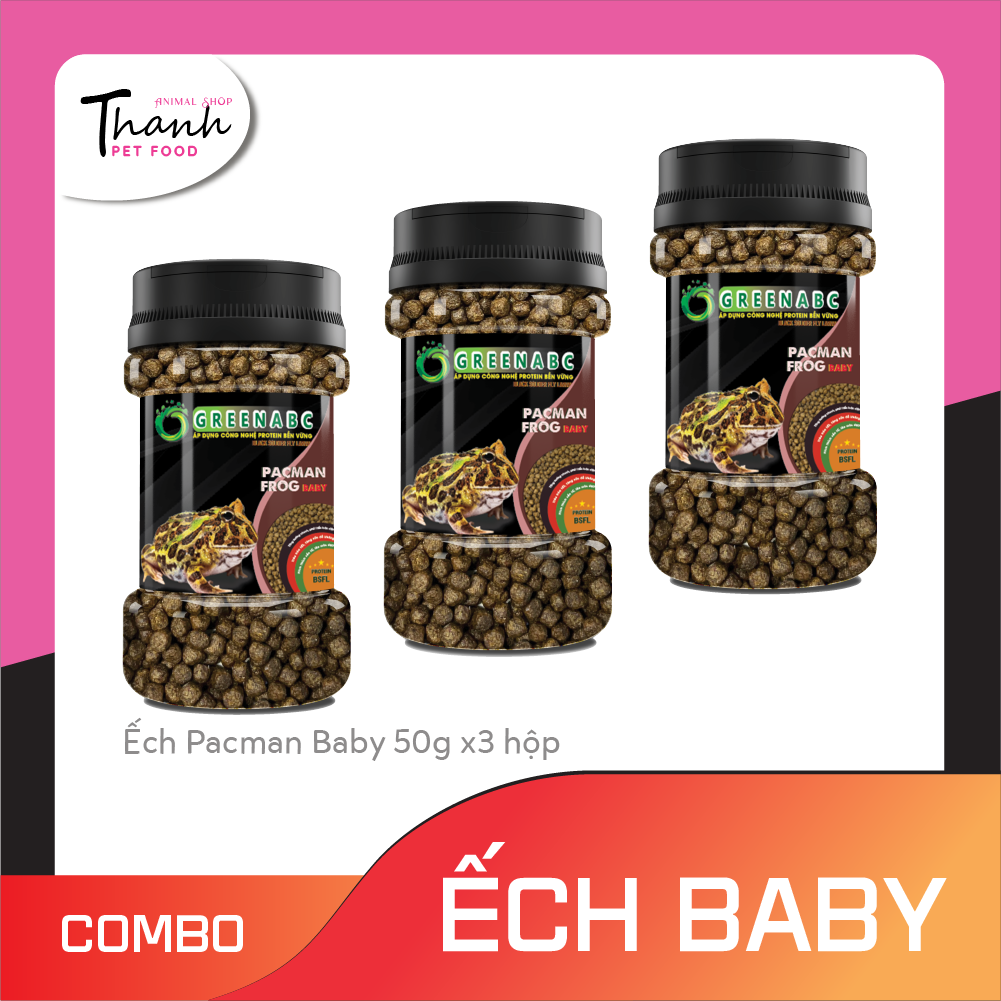 GREENABC - THỨC ĂN ẾCH PACMAN - HÀM LƯỢNG PROTEIN > 37% GREENABC là thức ăn bổ dưỡng dành cho ẾCH PACMAN. Đặc biệt sản phẩm GREENABC được sản xuất theo phương pháp Áp dụng công nghệ PROTEIN Bền Vững từ bột đạm G.Meal rất giàu PROTEIN – CANXI – LIPID có trong BSFL, đã được Mỹ (AAFCO) và EU chấp nhận đưa vào công thức cho ngành sản xuất thức ăn vật nuôi. Sản phẩm GREENABC cung cấp các giá trị dinh dưỡng bền vững cho Ếch Pacman, giúp:      + Kích thích vị giác, giúp ăn ngon miệng hơn.      + Tiêu hóa tốt, cơ thể hấp thu các dưỡng chất tối ưu. Đặc biệt với hàm lượng Protein cao, sản phẩm GREENABC giúp tăng trưởng nhanh, phát triển toàn diện.      + Kích thích sắc tố, lên màu đẹp.      + Tăng cường sức đề kháng ngăn ngừa bệnh tật.      + Cơ thể cân đối, săn chắc. Hộp 50g: viên 3ly Hộp 230g: viên 5ly, 7ly Thành phần dinh dưỡng và hướng dẫn sử dụng: