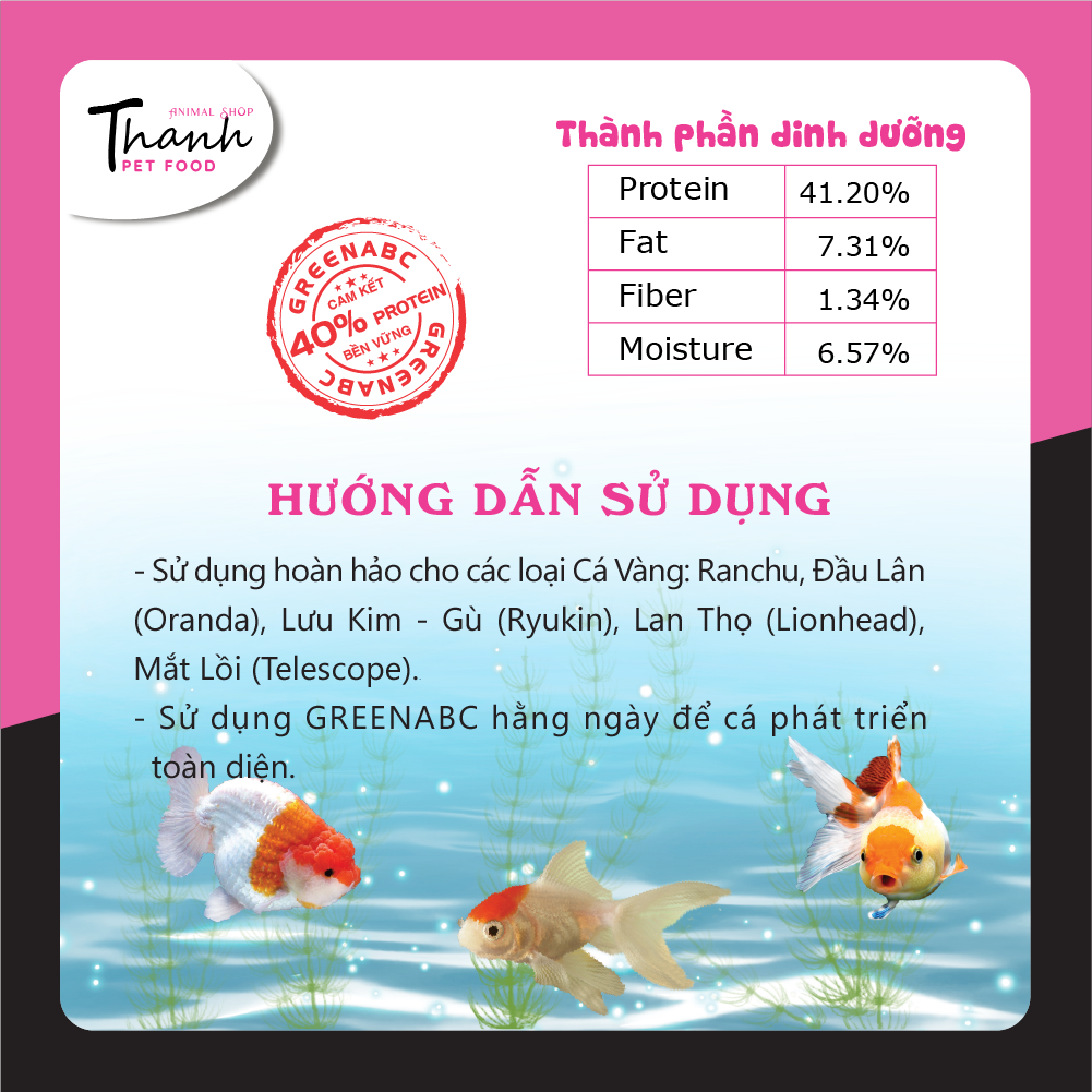 GREENABC - THỨC ĂN CÁ 3 ĐUÔI - HÀM LƯỢNG PROTEIN > 40%GREENABC là thức cao cấp dành cho các loại cá 3 ĐUÔI như: Ranchu, Đầu Lân (Oranda), Lưu Kim Gù (Ryukin), Lan Thọ (Lionhead), Mắt Lồi (Telesco...