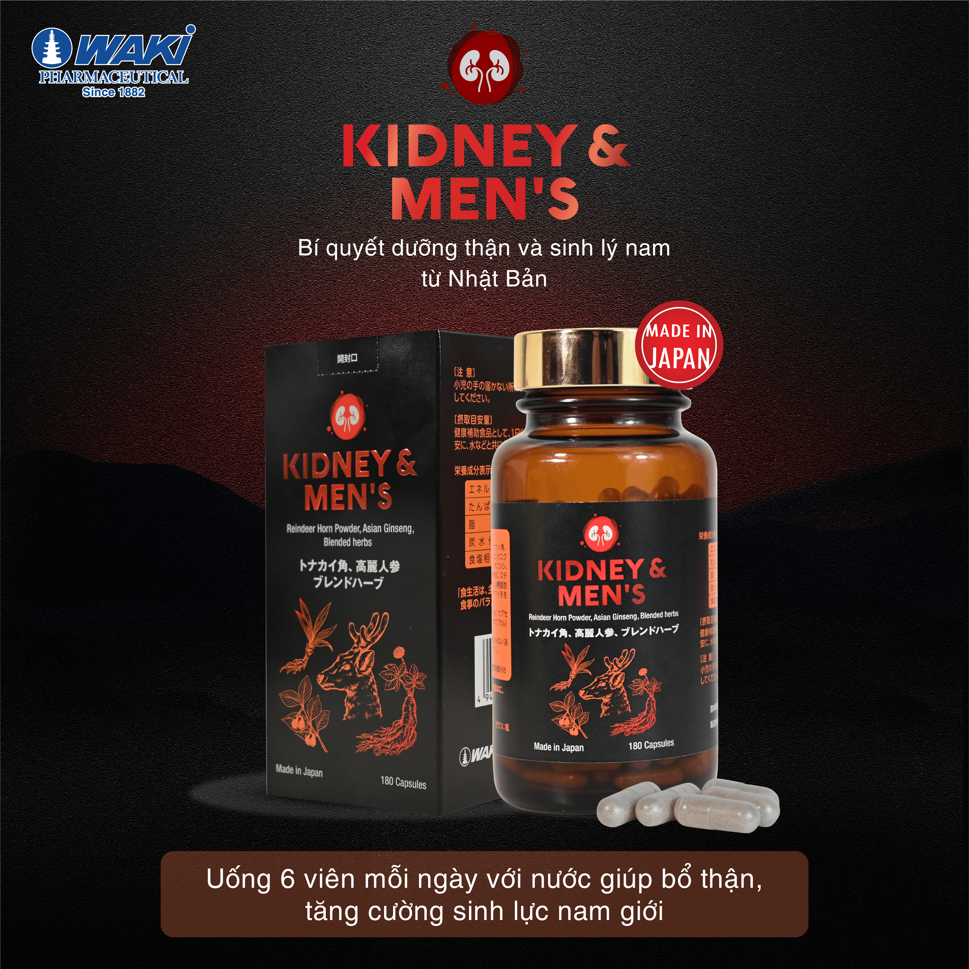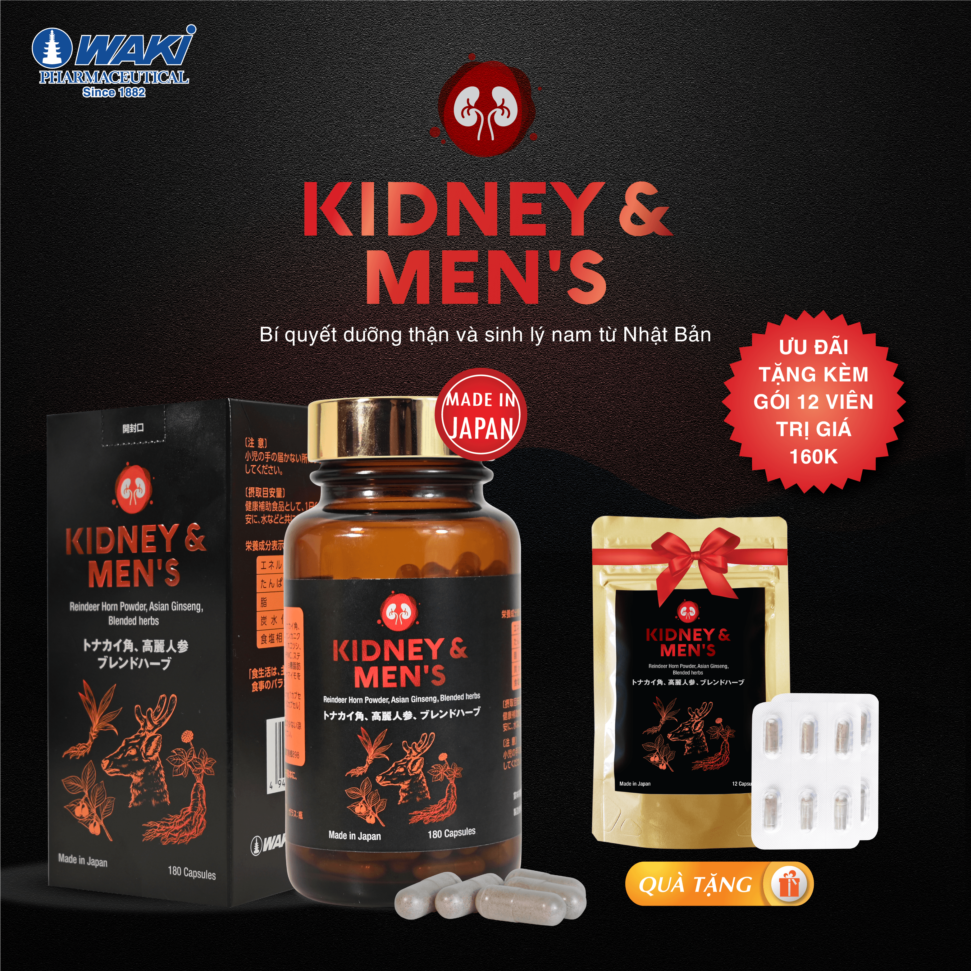 KIDNEY & MEN'S Sản phẩm Kidney & Men’s của Nhật Bản – Bí quyết dưỡng thận và sinh lý nam. Đây là một sản phẩm trong dòng sản phẩm chăm sóc sức khỏe của tập đoàn dược phẩm Waki Pharma có truyền thống 200 năm tại Nhật Bản chứa các thành phần hoàn toàn từ thiên nhiên giúp bồi bổ thận và sinh lực nam. THÀNH PHẦN ĐỘC ĐÁO CỦA SẢN PHẨM: