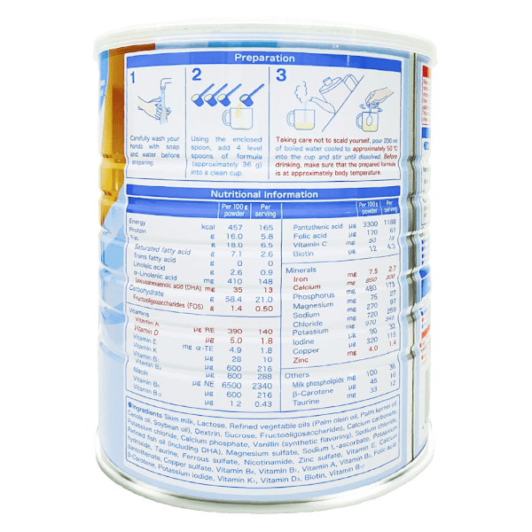 Sữa tách kem, Lactose, Dầu thực vật tinh luyện ( Dầu cọ olein hóa, dầu cọ, dầu hạt cải, dầu đậu nành ), Dextrin, Đường Sucrose, Fructooligosaccharides, Canxi cacbonat, Kali clorua, Canxi photphat, Vanillin ( hương liệu tổng hợp), Natri Clorua, Dầu cá tinh luyện ( có chứa DHA), Magiê sunfat, Natri L-ascorbat, Kali hyđrôxit, Taurine, Sắt sunfat, Nicotinamid, Kẽm sunfat, Vitamin E, Canxi pantothenat, Đồng sunfat, Vitamin B6 , VitaminB1 , Vitamin A, Vitamin B2 , Axit Folic, β-Caroten, Kali iotua, Vitamin K1 , Vitamin D3, Biotin, Vitamin B12