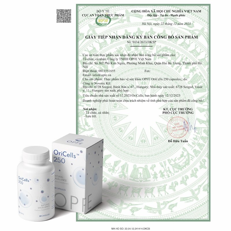 Thực phẩm BVSK OPFE OriCells 250 capsules được sản xuất tại Hungary (MADE IN EU), từ nguồn nguyên liệu 100% tự nhiên, đáp ứng đầy đủ các tiêu chuẩn khắt khe của Châu Âu. Thương hiệu OPFE đã được cấp giấy chứng nhận bảo hộ nhãn hiệu độc quyền tại EU và Việt Nam. Sản phẩm được cấp phép lưu hành tại Châu Âu bởi