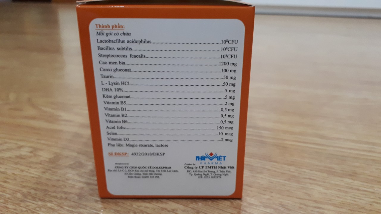Quy Cách Đóng Gói: Hộp 30 gói x 3g Thành Phần: Mỗi gói 3g chứa Lactobacillus acidophilus 108 CFU Taurin 50 mg Bacillus subtilis 108 CFU L - Lysin HCL 50 mg Streptococcus feacalis 108 CFU Vitamin B1 0.5 mg Cao men bia 1200 mg Vitamin B2 0.5 mg Canxi Gluconat 100 mg Vitamin B6 0.5 mg DHA 10% 1000 mcg Vitamin B5 2 mg Kẽm Gluconat 5 mg Vitamin D3 2 mcg Acid folic 150 mcg Phụ liệu lactose, magie stearat vừa đủ 3g Selen 10 mcg Công dụng :
