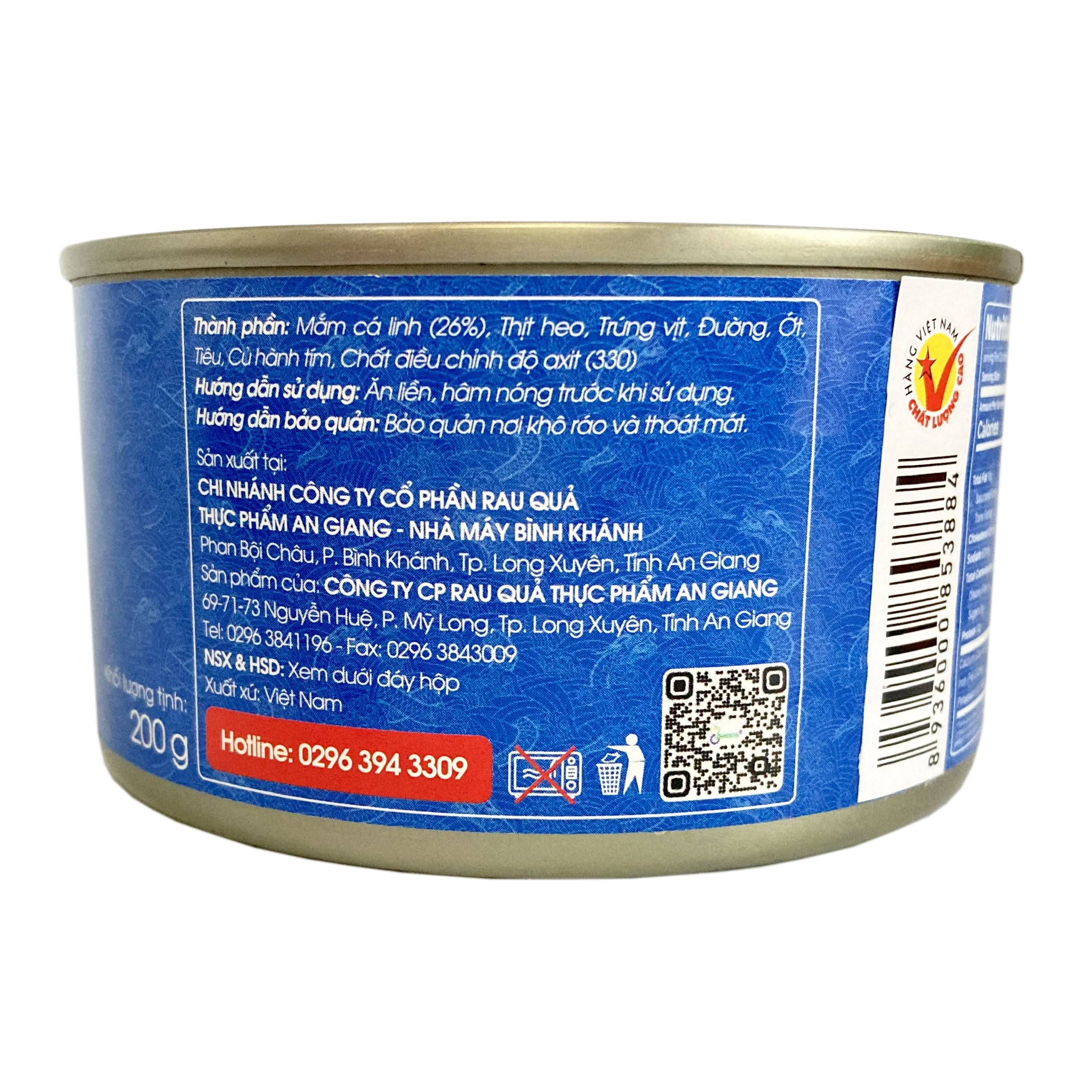 - Nguyên liệu: Mắm cá linh, thịt heo, trứng vịt, đường, ớt, tiêu, củ hành tím, chất điều chỉnh độ acid (E330)