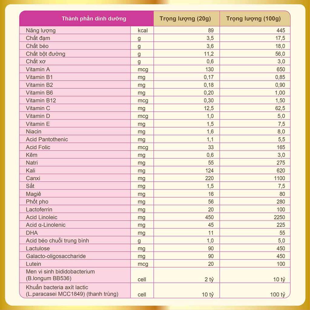 • 10 tỷ bào tử LAC-Shield (Lactobacillus paracasei MCC1849) là 1 “probiotics chuyên nghiệp” bảo vệ hệ tiêu hoá cũng như kích thích hệ miễn dịch Đối tượng sử dụng: Người lớn, người già cần bổ sung dinh dưỡng, tăng cường đề kháng. Người bệnh hoặc sau phẫu thuật cần hồi phục. Người bệnh tiểu đường, huyết áp, tim mạch. Trẻ em trên 3 tuổi. Hướng dẫn sử dụng: Bước 1: Vệ sinh sạch sẽ dụng cụ pha sữa trước khi tiến hành pha sữa. Bước 2: Cho 100ml nước ấm (hoặc nhiệt độ mong muốn) dưới 40 độ C vào ly pha với 1 gói sữa (tương đương 20g) Bước 3: Khuấy đều và uống trong vòng 20 phút sau khi pha. Lưu ý: Để hấp thụ lợi khuẩn tốt nên sử dụng nước nóng không quá 40 độ C và dùng ngay trong 20 phút sau khi pha. Quy cách đóng gói Thùng 12 lon x 300gr **Thực phẩm này không phải là thuốc và không có tác dụng thay thế thuốc chữa bệnh. ***Bao bì sản phẩm có thể thay đổi theo từng đợt hàng.