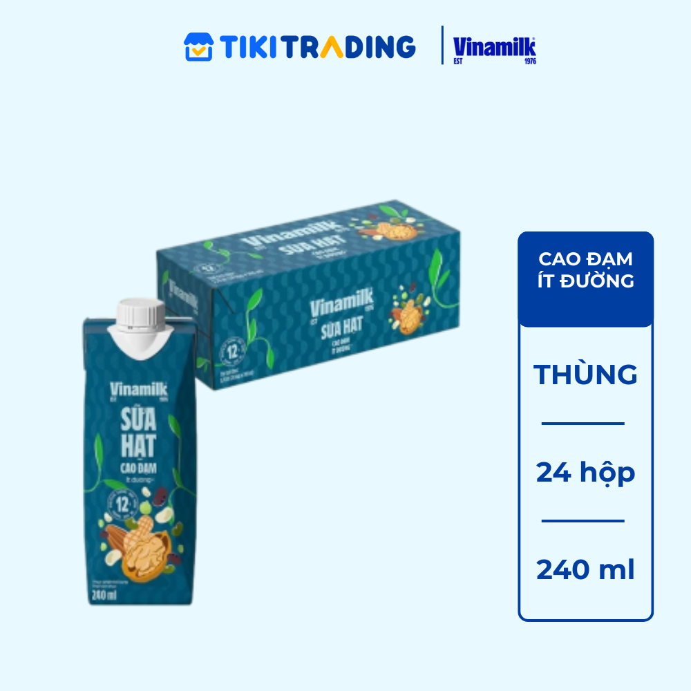 SỮA HẠT CAO ĐẠM VINAMILK HỘP 240ML: • Vị ngon độc bản kết hợp từ 7 loại hạt (đậu Hà Lan, hạt óc chó, hạnh nhân, đậu phộng, đậu trắng, đậu đen, đậu xanh) •