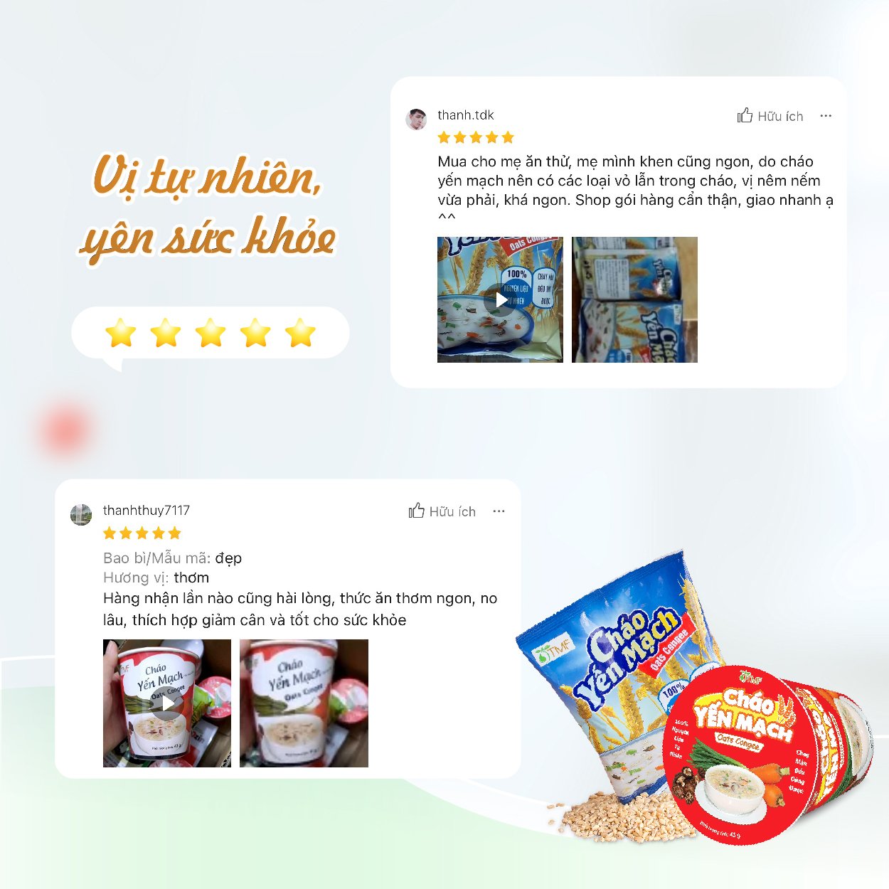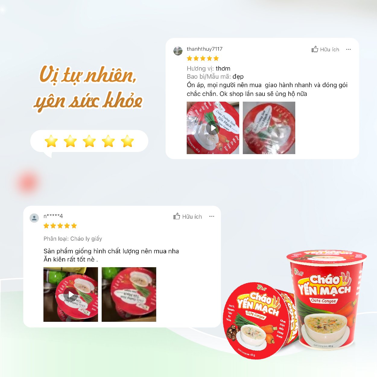 *Thành phần: - Yến mạch nguyên chất (60%), phôi cháo gạo. Gói rau củ: nấm đông cô sấy thăng hoa (2%); cà rốt, paro, ngò rí sấy thăng hoa. - Gói soup bột: hạt nêm