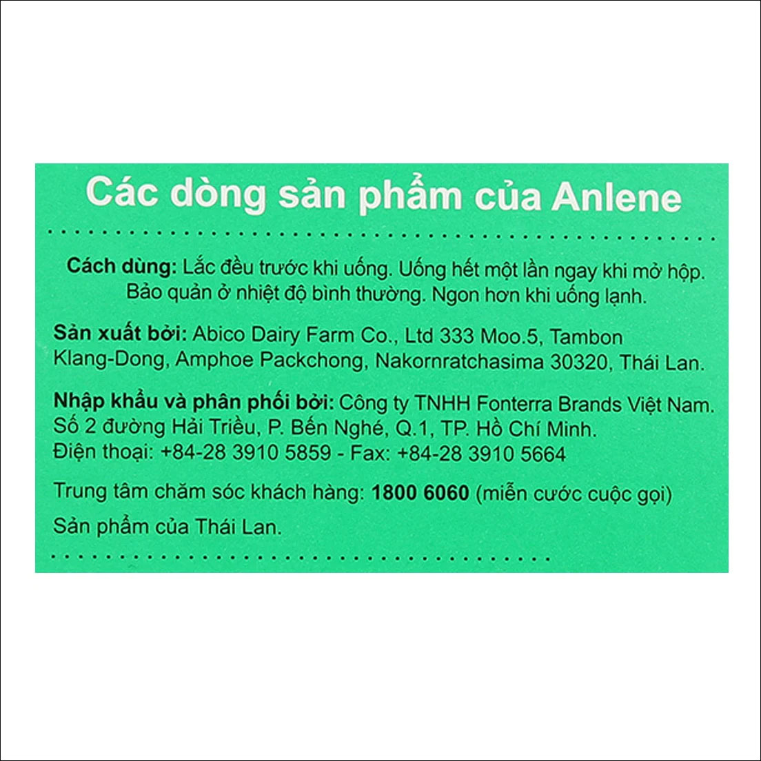 - Thiết kế dạng hộp nhỏ gọn tiện dụng cho bạn dễ dàng mang theo bất kì đâu và mức giá vô cùng hợp lý. Thành phần dinh dưỡng của sản phẩm Sữa bột pha sẵn Anlene hương Vani có thành phần chính bao gồm: Nước, sữa bột nguyên kem, đường, sữa bột không béo, hương vani tổng hợp,... Ngoài ra, sản phẩm cung cấp cho cơ thể khoảng 68 kcal trong 1 hộp sữa 125ml. Thành phần chi tiết Nước, sữa bột không béo (4.9%), sữa bột nguyên kem (4.8%), đường, tri-canxi photphat, phoscal, chất ổn định (cellulose gel INS460(i), cellulose gum INS466, carrageenan INS407), di-magie photphat, disodium photphat, hương vani tổng hợp, kẽm oxit, vitamin D3. Tác dụng của sản phẩm với sức khỏe Anlene Đậm đặc 4X với công thức cải tiến mới giúp xương bạn luôn chắc khỏe để tận hưởng cuộc sống năng động. Hương thơm vani thơm ngon, dễ dùng, giúp người dùng hấp thụ tối đa dinh dưỡng từ sản phẩm. Đối tượng Sản phẩm thích hợp cho mọi người từ 19 tuổi trở lên dùng bổ sung dinh dưỡng hàng ngày. Hướng dẫn sử dụng