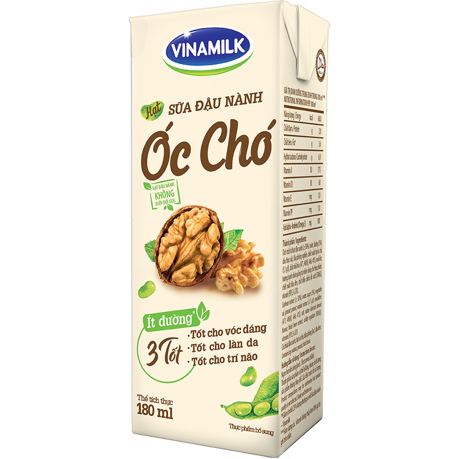 Mua tại TiktokQuy cách thùng: 12 lốc/thùng Thực phẩm bổ sung Sữa đậu nành Vinamilk hạt Óc chó - Lốc 4 hộp x 180ml Được làm từ hạt Óc chó cao cấp từ Mỹ, giàu chất chống oxy hóa tốt cho trí não. Kết hợp cùng những hạt đậu nành nguyên chất 100% được chọn lọc, không biến đổi gen, thơm ngon tự nhiên. Bổ sung nhiều loại Vitamin: A, D3, E, PP, Omega 3 Lợi ích 3 TỐT: đẹp dáng, đẹp da, tốt cho trí não