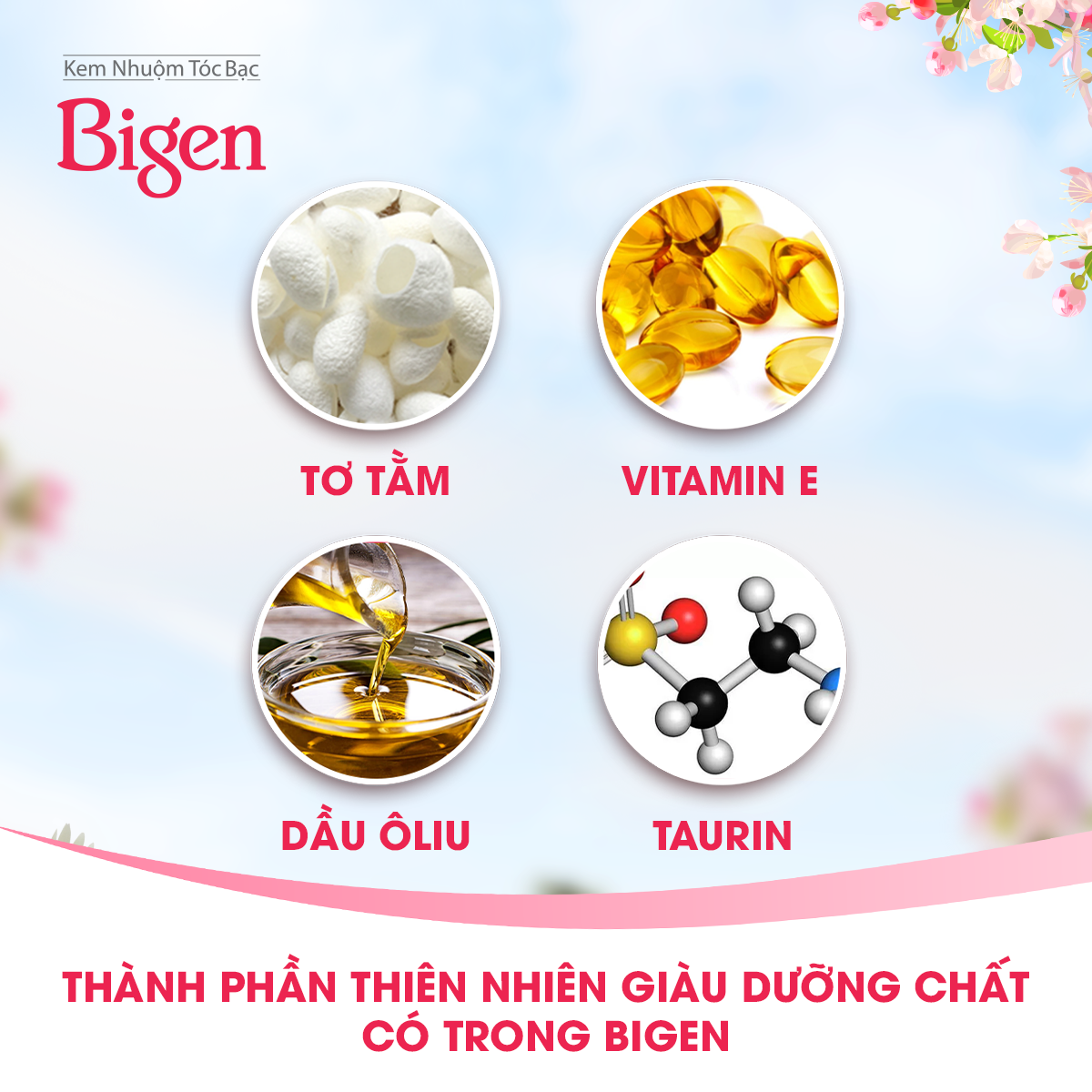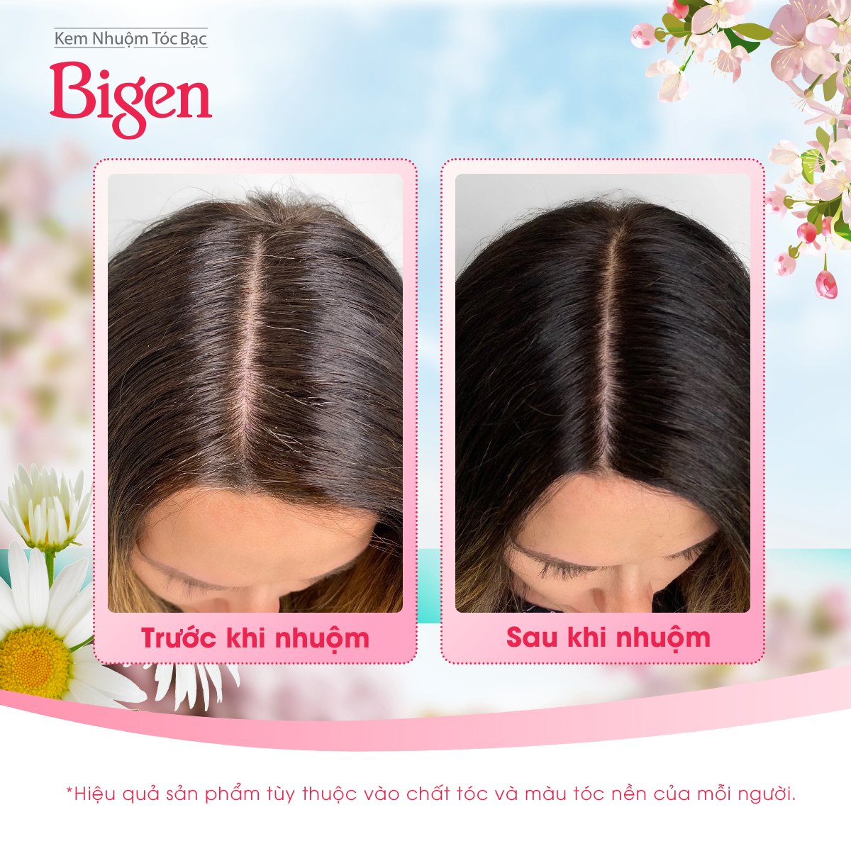 - Thuốc nhuộm phủ bạc Bigen với công thức tỷ lệ hạt màu tối cao giúp nhuộm phủ bạc chuẩn Nhật Bản.