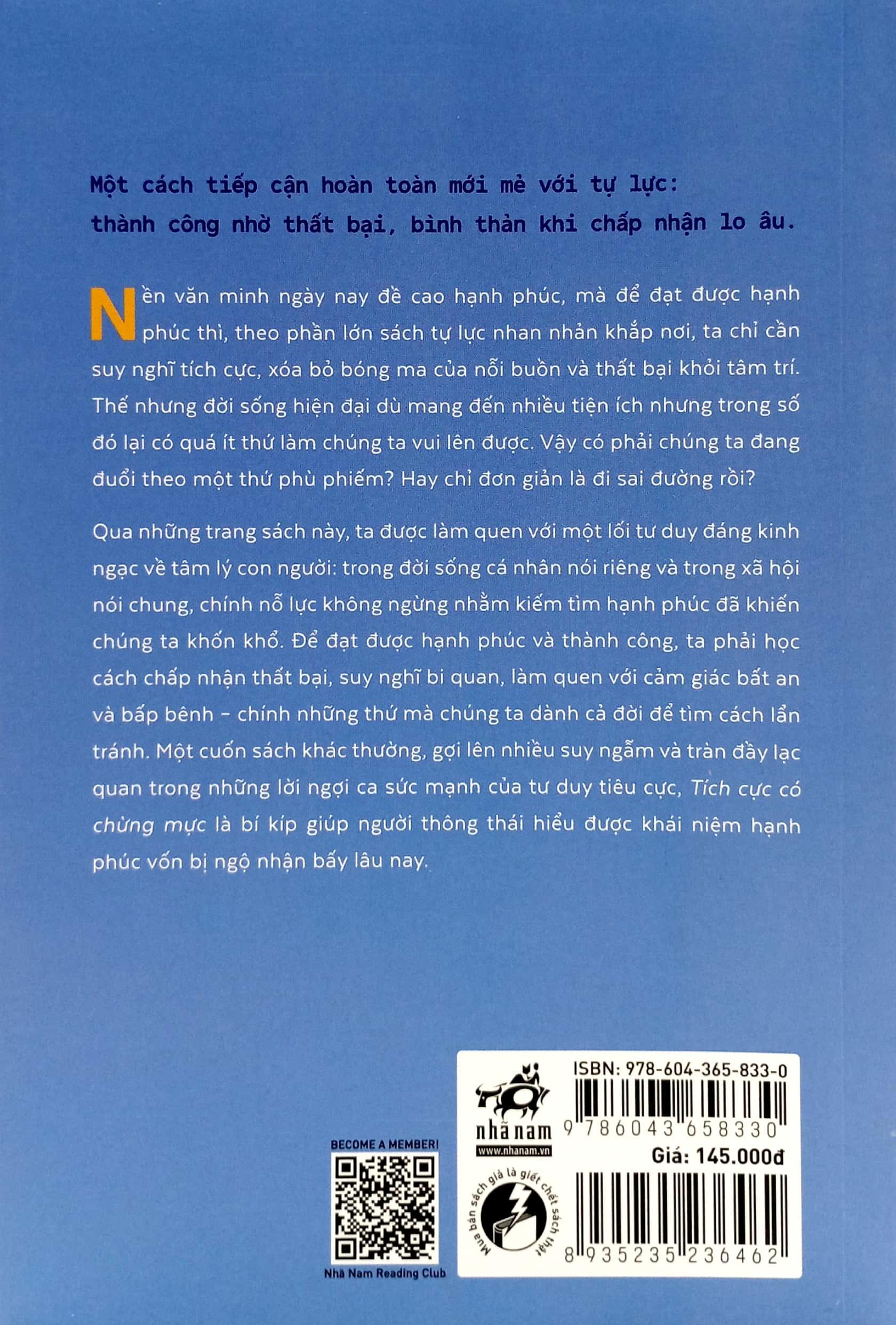 Qua những trang sách này, ta được làm quen với một lối tư duy đáng kinh ngạc về tâm lý con người: trong đời sống cá nhân nói riêng và trong xã hội nói chung, chính nỗ lực không ngừng nhằm kiếm tìm hạnh phúc đã khiến chúng ta khốn khổ. Để đạt được hạnh phúc và thành công, ta phải học cách chấp nhận thất bại, suy nghĩ bi quan, làm quen với cảm giác bất an và bấp bênh - chính những thứ mà chúng ta dành cả đời để tìm cách lẩn tránh. Một cuốn sách khác thường, gợi lên nhiều suy ngẫm và tràn đầy lạc quan trong những lời ngợi ca sức mạnh của tư duy tiêu cực, Tích cực có chừng mực là bí kíp giúp người thông thái hiểu được khái niệm hạnh phúc vốn bị ngộ nhận bấy lâu nay.