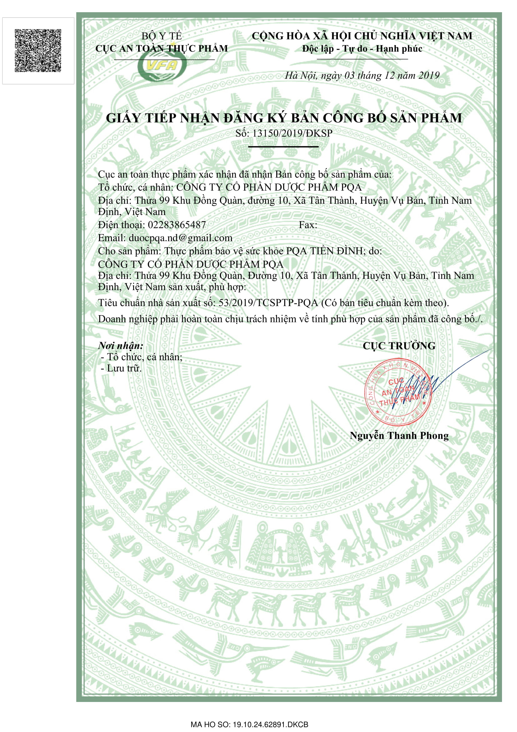 - Địa chỉ sản xuất: Công ty Cổ phần Dược phẩm PQA. Thửa 99, Khu Đồng Quàn, Xã Tân Thành, Huyện Vụ Bản, Tỉnh Nam Định. THÀNH PHẦN: