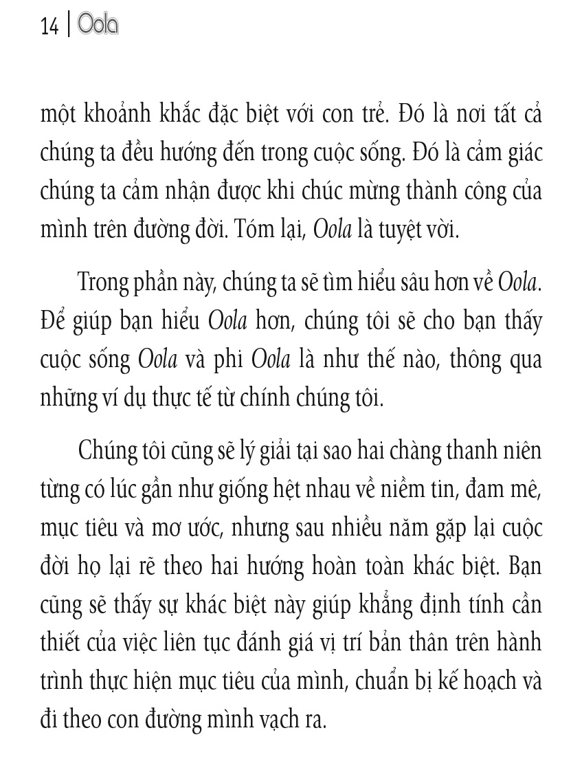 Cuốn sách “Oola – Tìm bình yên giữa vạn biến” đã định nghĩa lại thế nào là một cuộc sống tuyệt vời mà bất cứ ai trong chúng ta cũng khao khát và tìm cách đạt được nó. Đó là cuộc sống cân bằng, mãn nguyện về sức khỏe (fitness), tài chính (finance), gia đình (family), công việc (field), đức tin (faith), bạn bè (friends) và niềm vui (fun).