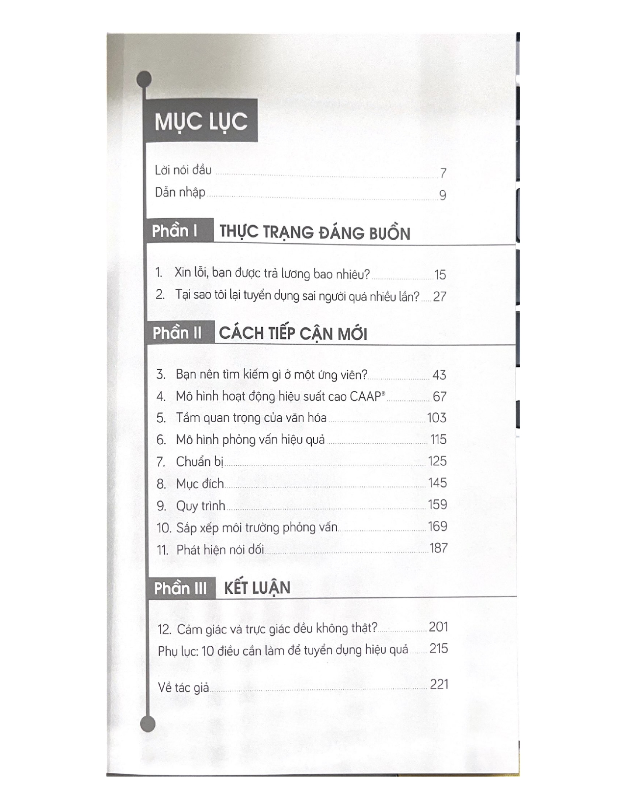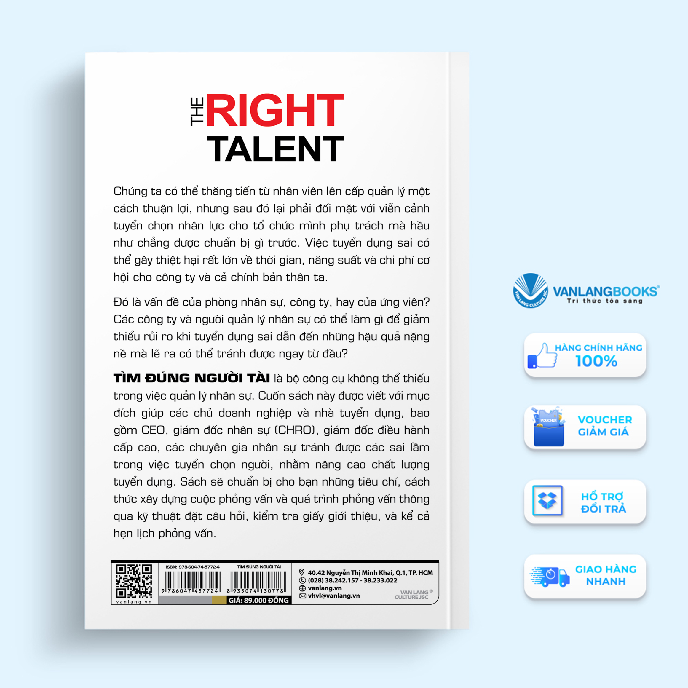 TÌM ĐÚNG NGƯỜI TÀI là bộ công cụ không thể thiếu trong việc quản lý nhân sự. Cuốn sách này được viết với mục đích giúp các chủ doanh nghiệp và nhà tuyển dụng, bao gồm CEO, giám đốc nhân sự (CHRO), giám đốc điều hành cấp cao, các chuyên gia nhân sự tránh được các sai lầm trong việc tuyển chọn người, nhằm nâng cao chất lượng tuyển dụng. Sách sẽ chuẩn bị cho bạn những tiêu chí, cách thức xây dựng cuộc phỏng vấn và quá trình phỏng vấn thông qua kỹ thuật đặt câu hỏi, kiểm tra giấy giới thiệu, và kể cả hẹn lịch phỏng vấn.