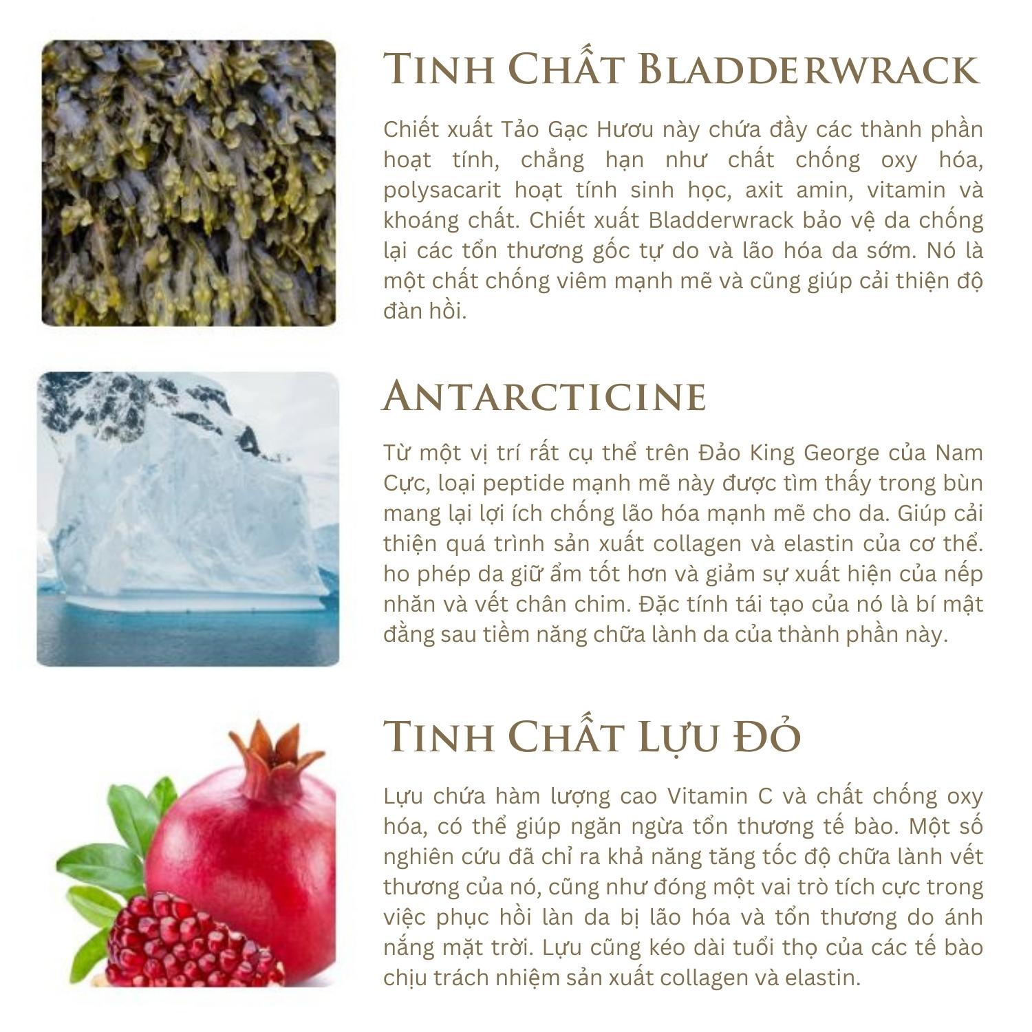 Tinh chất vàng kết hợp với Omega 3, Vitamin cùng một số hoạt chất Niacinamide, Alpha A giúp mang lại độ ẩm cần thiết nhất cho da và cung cấp dưỡng chất Collagen giúp thẩm