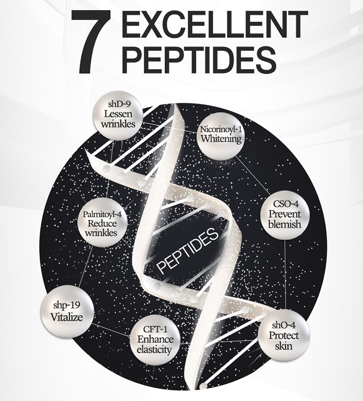 - 7 loại Peptide kết hợp với nhau theo tỷ lệ tối ưu giúp cải thiện độ đàn hồi của da, kích thích tăng sinh collagen và tái tạo tế bào, cải thiện đáng kể về số lượng và cải thiện độ sâu của các nếp nhăn.