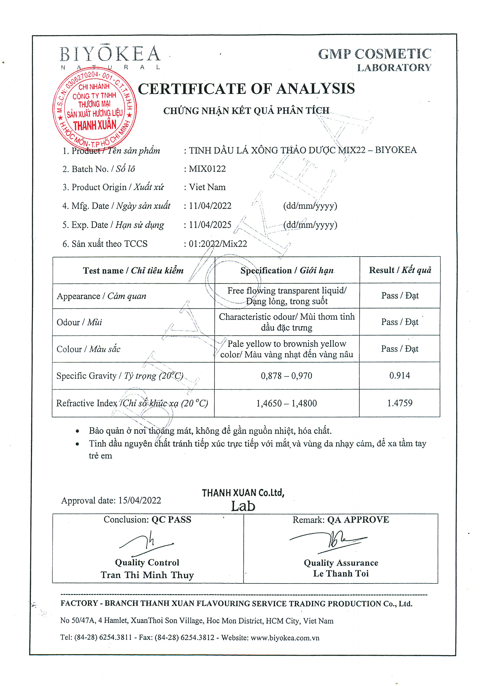 Tên Sản Phẩm: Tinh Dầu Lá Xông Thảo Dược Mix 22 Tên Tiếng Anh: Essential Oil Mix 22 Aromatherapy Đặc điểm: