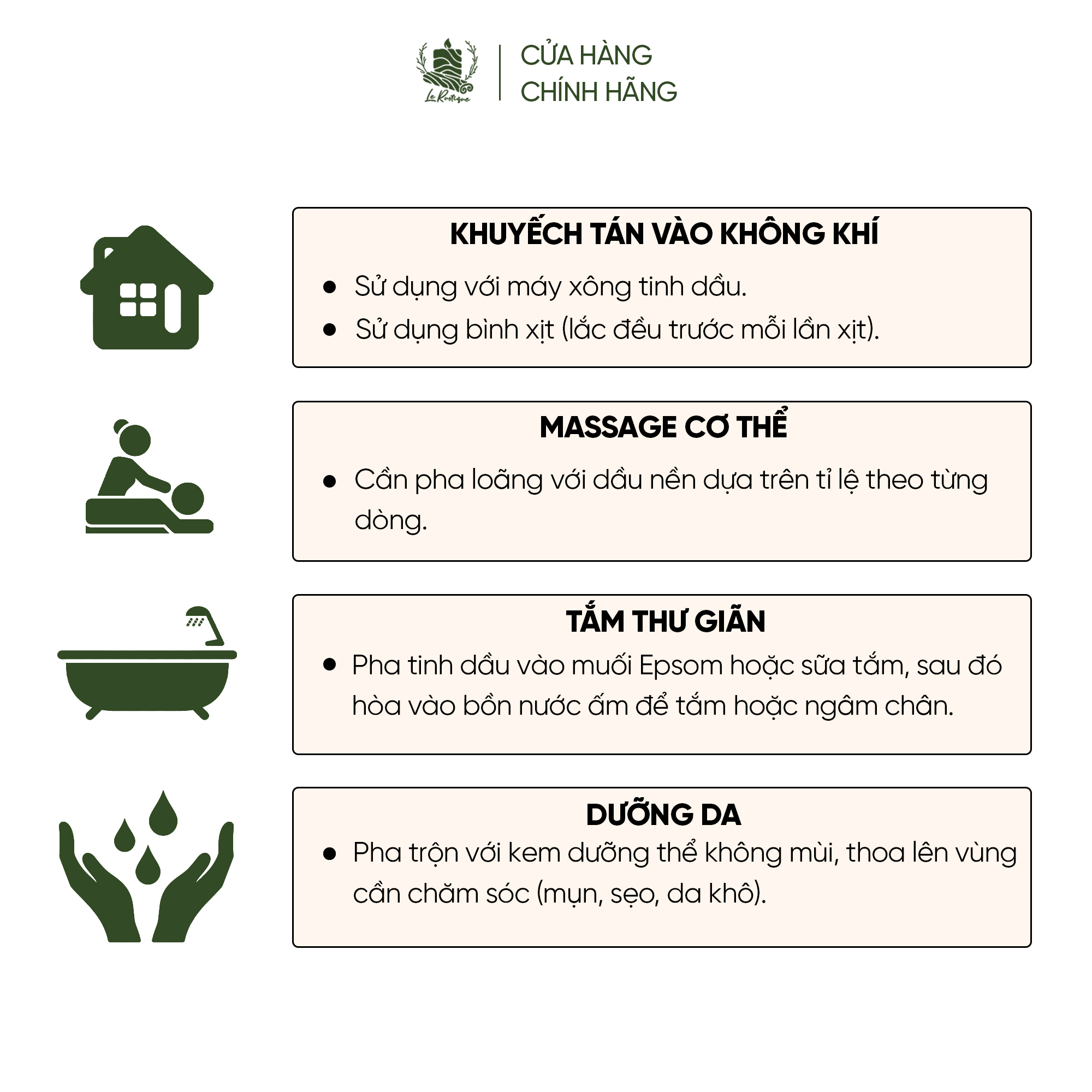 • Thận trọng (nếu dùng trên da): Đối với người có da quá nhạy cảm, bị bệnh hoặc bị tổn thương, người đang sử dụng thuốc được chuyển hóa bởi CYP2B6 và trẻ em dưới 15 tuổi. (*) Các thông tin được tổng hợp từ sách Essential Oil Safety: A Guide for Health Care Professionals, tái bản lần 02 năm 2014 của tác giả Robert Tisserand và Rodney Young.   ► CAM KẾT: Le Rustique Việt Nam cam kết sản phẩm đúng như hình. ➢ Trường hợp nhận hàng mà không đúng mô tả, sai số lượng, nhầm hàng hoặc hàng bể vỡ trong quá trình vận chuyển... Nhắn tin ngay cho shop TRONG VÒNG 24H sau khi nhận hàng để được giải quyết và hỗ trợ nhé. ➢ Khi nhận hàng, vui lòng quay VIDEO MỞ HÀNG để bảo đảm quyền lợi nếu có sai sót và hỗ trợ giải quyết vấn đề cho bạn nhanh nhất có thể.