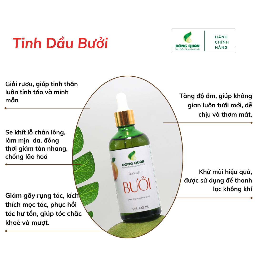 Mua tại TiktokBưởi giống như các loại trái cây có múi khác, tinh dầu của nó có trong vỏ và được chiết xuất bằng cách nén. Nhiều đặc tính y học của nó giống như tinh dầu của các loại trái cây có múi khác. Tinh dầu vỏ bưởi chứa các hai thành phần chủ yếu là Limonene và myrcene. Các lợi ích của Tinh Dầu Vỏ Bưởi nguyên chất