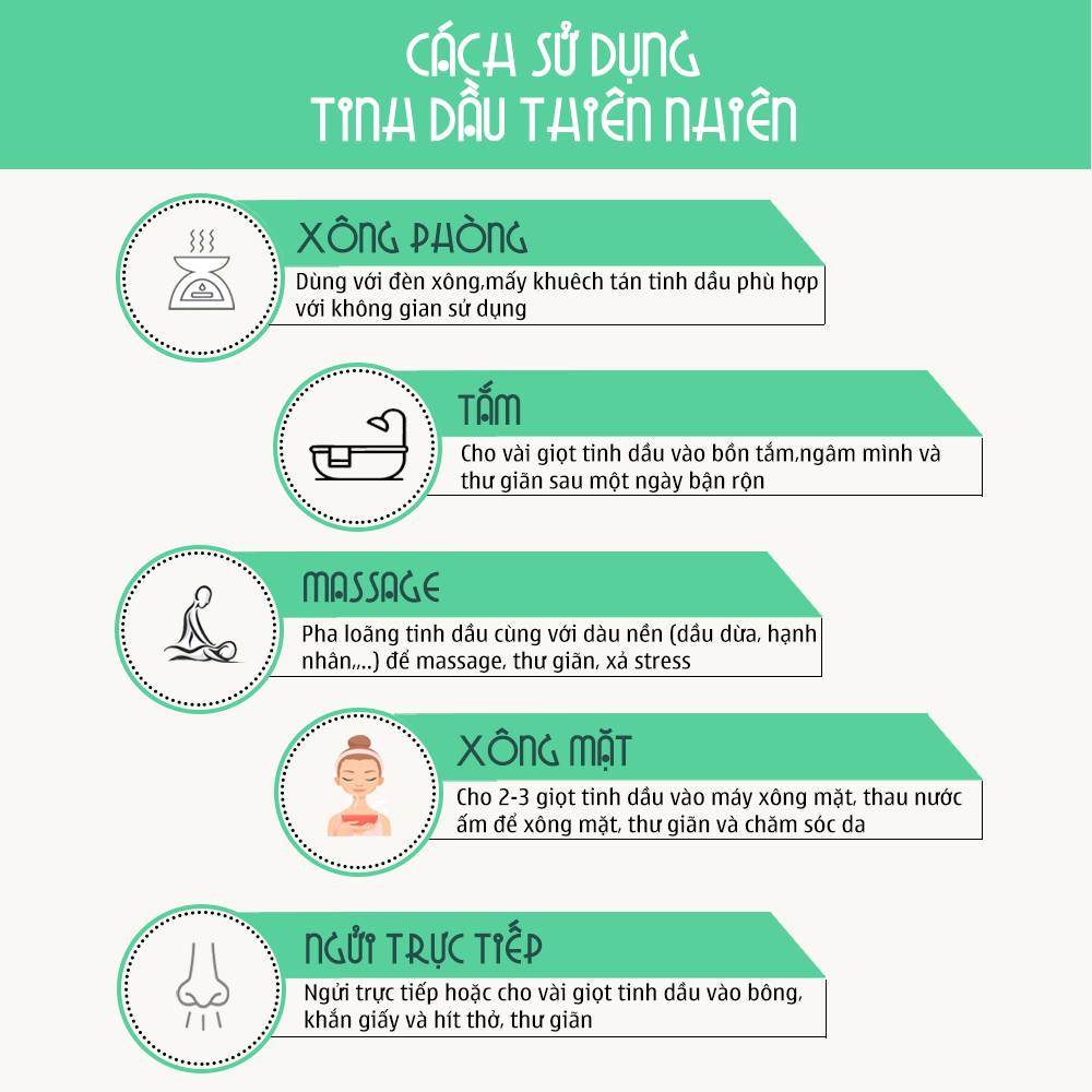 - Xông hương thư giãn, cân bằng cảm xúc: cho 3-5 giọt tinh dầu vào đèn xông hoặc máy khuếch tán tinh dầu để mùi hương lan tỏa khắp gian phòng. Khử mùi, đuổi muỗi, côn trùng: cho 2-3 giọt tinh dầu vào nước lau nhà hoặc cho 3-5 giọt tinh dầu và 100ml nước vào bình xịt, lắc đều trước khi dùng. Massage thư giãn, chăm sóc da: pha loãng tinh dầu với các loại dầu nền (dầu dừa, hạnh nhân, jojoba,) theo công thức 3-5 giọt tinh dầu và 30ml dầu nền. Tắm, thư giãn, thải độc: cho 5-10 giọt tinh dầu cùng 300gram muối epsom vào bồn tắm, ngâm mình trong khoảng 10-15 phút giúp thư giãn, giảm áp lực, loại bỏ các bụi bẩn, tế bào chết trên da. Ngâm chân: cho 1-2 giọt tinh dầu vào 1 lít nước ấm để ngâm chân giúp thư giãn, lưu thông khí huyết và có giấc ngủ sâu. Ủ thơm quần áo: cho 2-3 giọt tinh dầu vào lồng giặt ở bước xả quần áo. Có thể cho tinh dầu vào khăn giấy, bồng gòn và đặt vào góc tủ quần áo. Xông hơi, giải cảm: cho 3-5 giọt tinh dầu vào chậu nước ấm, trùm khín người, hít thở sâu giúp cơ thể ra mồ hôi, lưu thông khí huyết, cơ thể thư thái và sảng khoái hơn. Hỗ trợ trị gàu và tóc dầu: Cho 2-3 giọt tinh dầu vào nước ấm hoặc dầu nền sau đó massage nhẹ nhàng lên da đầu, tóc. Sau đó xả lại bằng nước sạch. LƯU Ý: