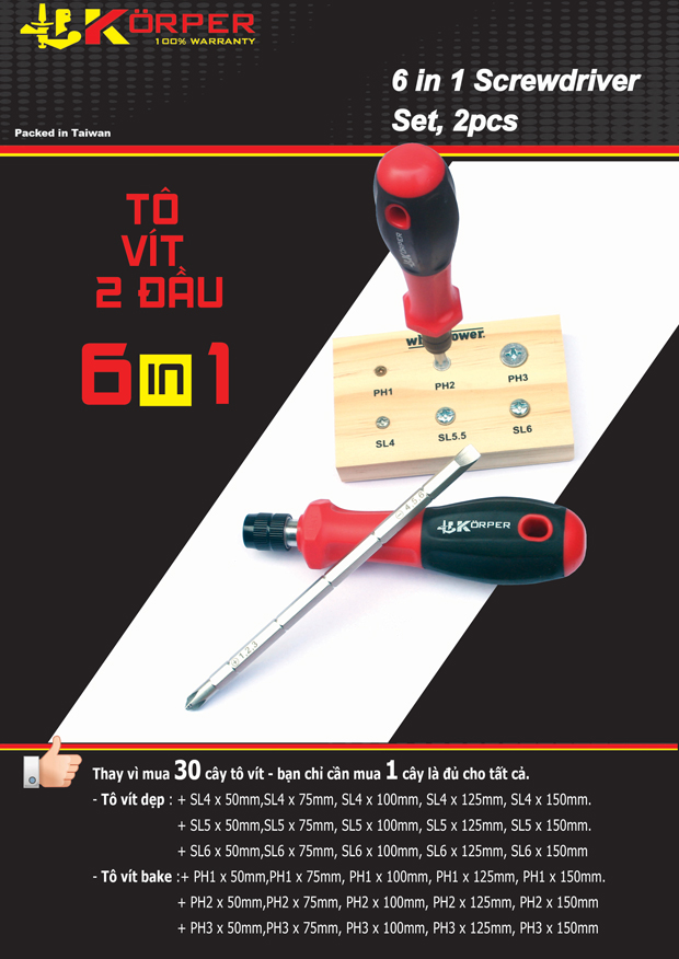 - Tô vít đa năng 6 trong 1 Körper KP-S11-8602 đến từ Đức mang đến cho bạn sự tiện lợi và tiết kiệm. Điều nổi bật của cây tô vít là một mũi vít bạn có 3 kích thước khác nhau như 1 đầu dẹp đã có 3 size: 4mm, 5mm và 6mm, tương tự như đầu bake PH1, PH2 và PH3.