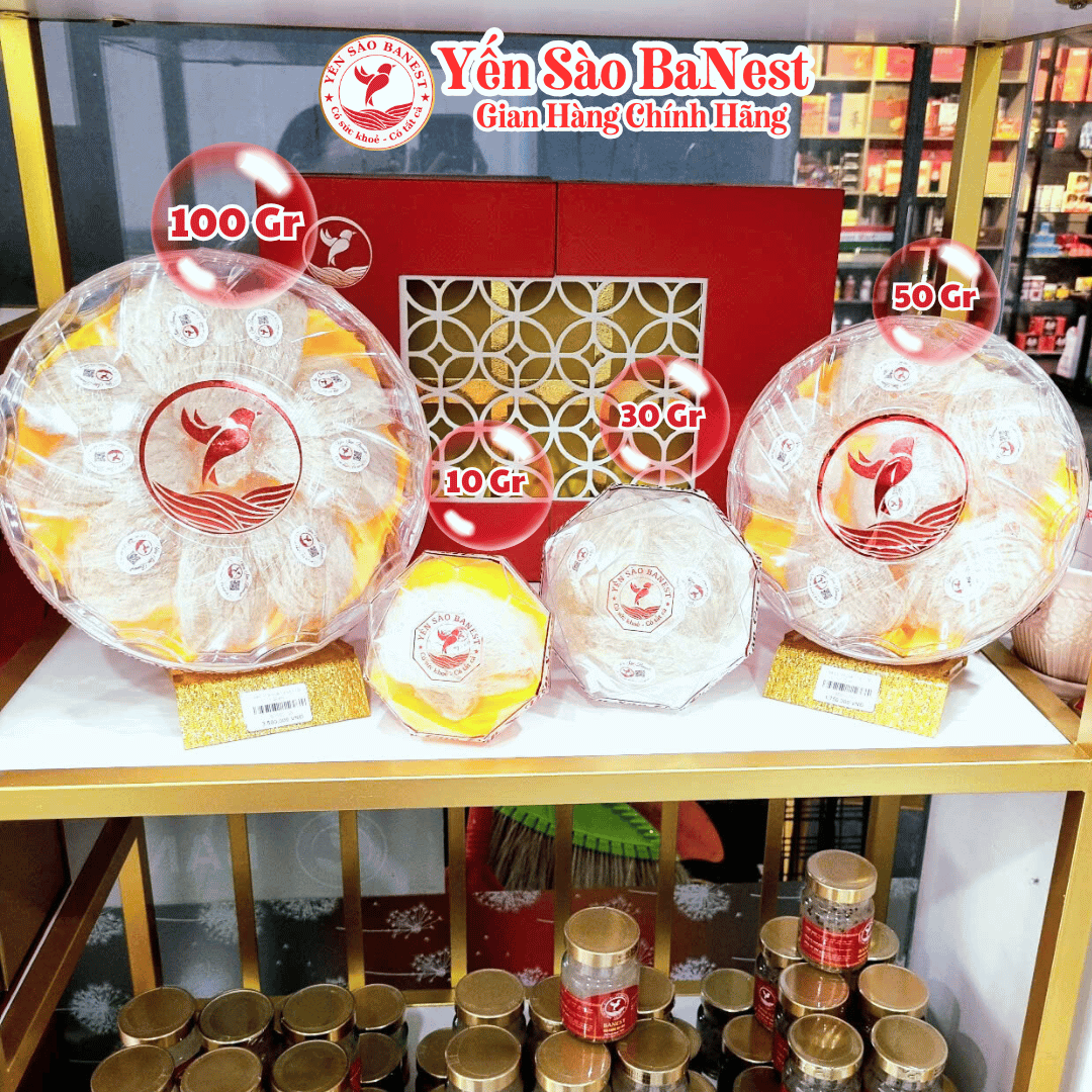 - Yến có màu trắng ngà , 100gr (10-18 tổ) , 50gr (5-8 tổ), không pha trộn, tỉ lệ sợi 80% -ruột 20% trong 1 tổ yến 2 lớp; tỉ lệ sợi 60% - ruột 40% trong 1 tổ yến 1 lớp. Cam kết từ Banest