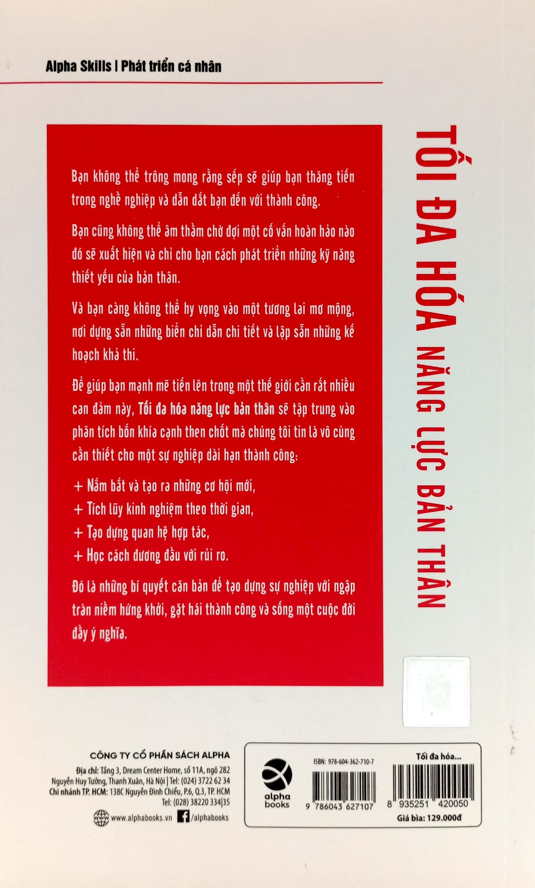 Tối Đa Hóa Năng Lực Bản Thân (Tái Bản 2023) Bạn cũng không thể âm thầm chờ đợi một cố vấn hoàn hảo nào đó sẽ xuất hiện và chỉ cho bạn cách phát triển những kỹ năng thiết yếu của bản thân. Và bạn càng không thể hy vọng vào một tương lai mơ mộng, nơi dựng sẵn những biển chỉ dẫn chi tiết và lập sẵn những kế hoạch khả thi. Để giúp bạn mạnh mẽ tiến lên trong một thế giới cần rất nhiều can đảm này, Tối đa hóa năng lực bản thân sẽ tập trung vào phân tích bốn khía cạnh then chốt mà chúng tôi tin là vô cùng cần thiết cho một sự nghệp dài hạn thành công: