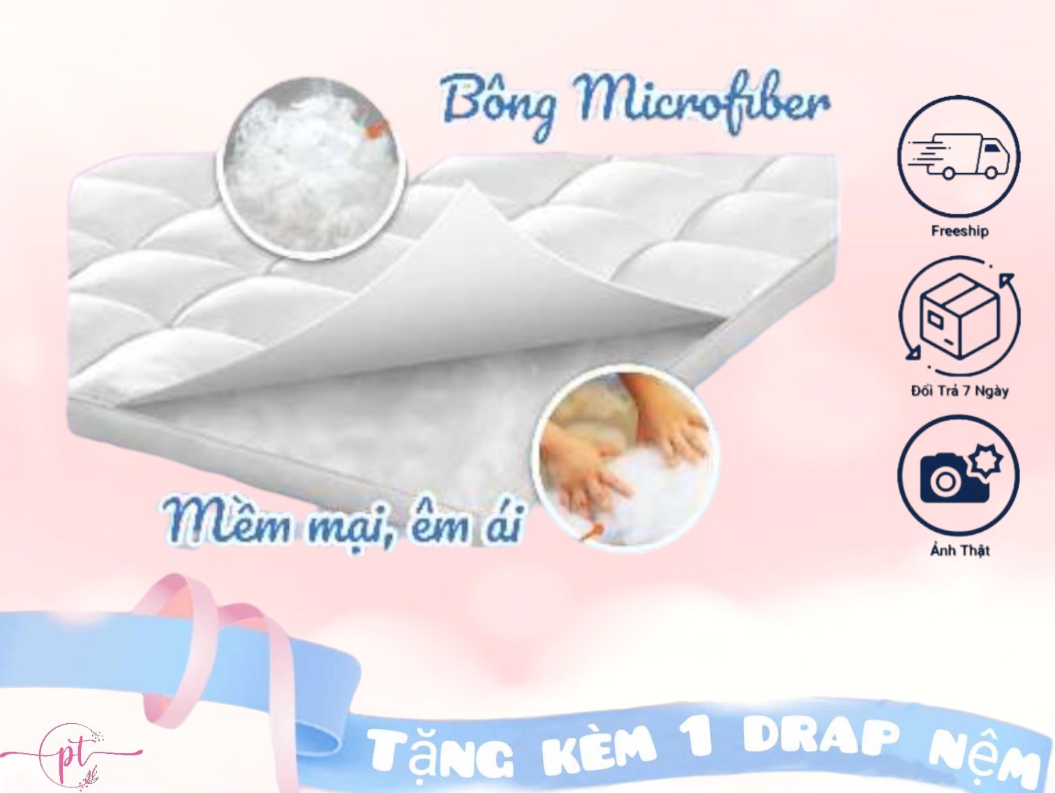 - Topper sử dụng bông Microfiber siêu mềm mịn, đảm bảo cho bạn cảm giác êm ái, bồng bềnh như “Ngủ trên mây”