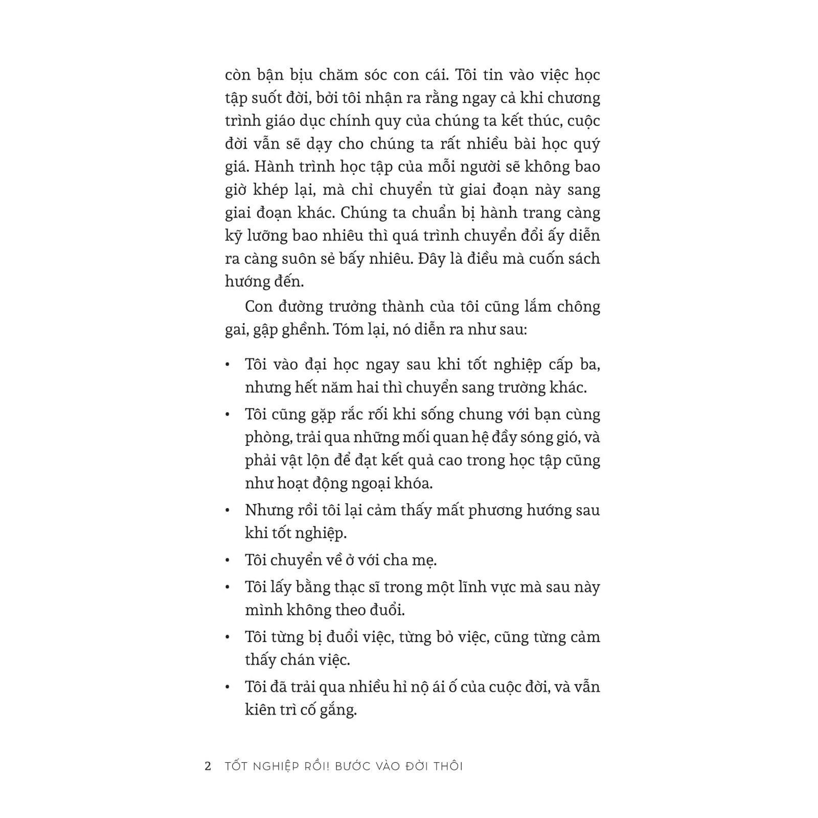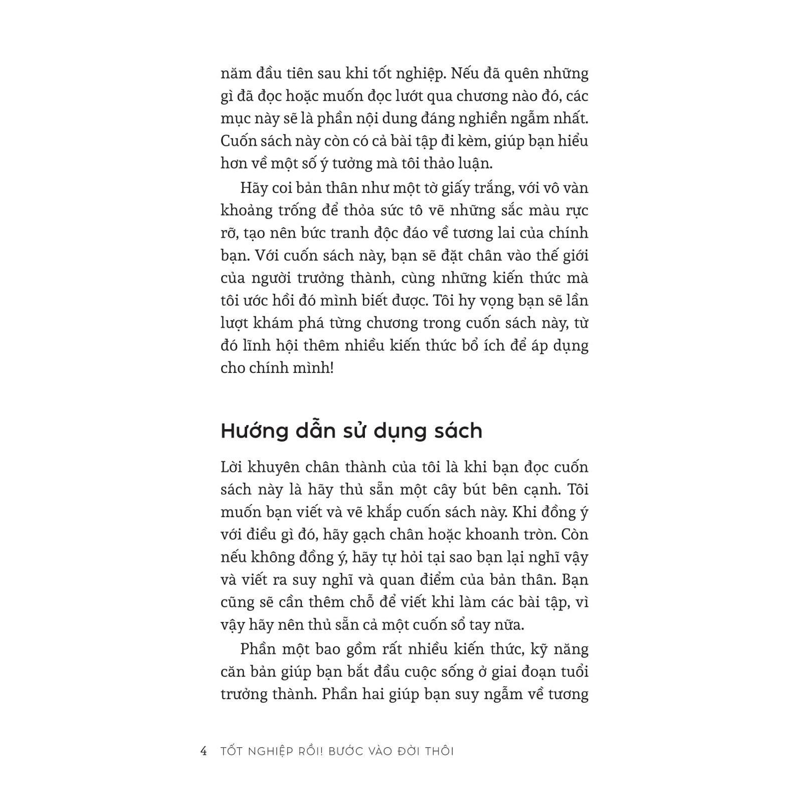Tốt Nghiệp Rồi! Bước Vào Đời Thôi... - Cẩm Nang Rèn Luyện Kỹ Năng Cho Cuộc Sống Trưởng Thành Quyển sách gồm các kỹ năng quan trọng cho các bạn trẻ tốt nghiệp đại học hoặc trung học bước vào đời, như kỹ năng khi đi phỏng vấn, đi làm lần đầu, xây dựng mối quan hệ, cách thiết lập mục tiêu, cách định hướng tương lai. Làm sao để tìm chỗ ở? Làm sao để có được buổi phỏng vấn xin việc? Thẻ tín dụng hoạt động thế nào? Cuốn sách này chính là tấm bản đồ dẫn đường giúp bạn vượt qua giai đoạn thú vị (nhưng cũng đầy thử thách) này của cuộc đời, sau khi đã tốt nghiệp trung học hoặc đại học. Từ việc tìm hiểu về tiền bạc, các mối quan hệ đến chăm sóc bản thân và kiên trì với mục tiêu. Cuốn sách này cung cấp cho bạn những kiến thức nền tảng - và còn hơn thế nữa - để bạn có thể tự tin đối mặt trực diện với “thế giới thực”.