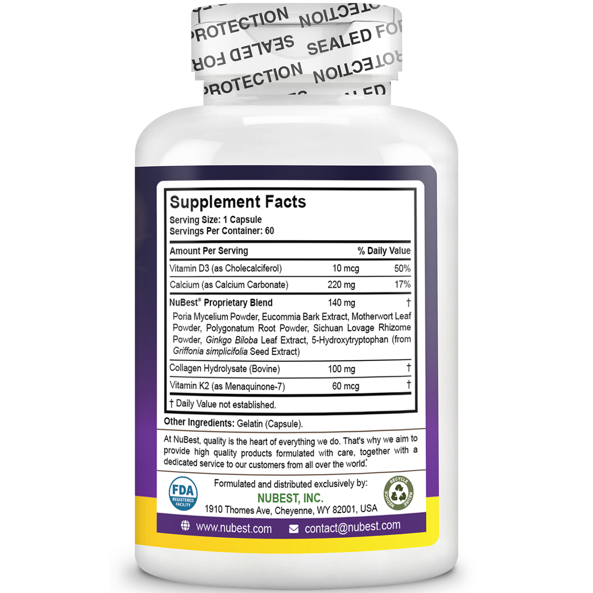 THỰC PHẨM BẢO VỆ SỨC KHỎE NUBEST TALL 10+ ★ Thành phần sản phẩm TPBVSK NuBest Tall 10+ chứa các thành phần:Vitamin D3 (dưới dạng Cholecalciferol), Canxi (dưới dạng Canxi cacbonat), Collagen thủy phân (từ Bò), Bột Bạch phục linh, Chiết xuất vỏ cây Đỗ trọng, Bột lá Ích mẫu, Bột rễ Hoành tinh , Bột Xuyên khung, Chiết xuất lá Bạch quả, 5-Hydroxytryptophan (Từ chiết xuất hạt đậu đen Châu Phi – Griffonia Simplicifolia), Vitamin K2 (dưới dạng Menaquinone-7). ★ Công dụng Thực phẩm chức năng bảo vệ sức khỏe NuBest Tall 10+ bổ sung Canxi và vitamin D, hỗ trợ phát triển xương, hỗ trợ xương chắc khỏe. ★ Đối tượng sử dụng Trẻ em từ 10 tuổi trở lên và thanh thiếu niên có nhu cầu bổ sung Canxi và vitamin D để hỗ trợ phát triển xương chắc khỏe. ★ Hướng dẫn sử dụng Uống mỗi lần 1 viên, ngày 2 lần, uống sau ăn. Để có hiệu quả tốt nhất, nên được sử dụng kết hợp NuBest Tall 10+ với chế độ ăn lành mạnh, tập thể dục thường xuyên, ngủ đủ và ngủ trước 11 giờ tối. Lưu ý khi sử dụng: Không sử dụng nếu tem an toàn bị rách hở. Không dùng cho người mẫn cảm, kiêng kỵ với bất kỳ thành phần nào của sản phẩm. Nếu đang mang thai, cho con bú hoặc đang dùng bất kỳ loại thuốc nào nên tham khảo ý kiến bác sĩ trước khi sử dụng. Ngừng sử dụng sản phẩm và liên hệ với bác sĩ nếu có bất kỳ tác dụng phụ nào xảy ra. ★ Chứng nhận sản phẩm Tại Mỹ: Thực phẩm bảo vệ sức khỏe NuBest Tall 10+ được sản xuất trên dây chuyền đạt cGMP. Sản phẩm đã được cơ quan chức năng của Mỹ cấp phép lưu hành tự do trên toàn liên bang Mỹ. Tại Việt Nam: Sản phẩm đã được Cơ quan nhà nước cấp giấy tiếp nhận đăng ký bản công bố sản phẩm số: 10783/2021/ĐKSP. Giấy xác nhận quảng cáo số: 1742/2022/XNQC-ATTP. ★ Nhận biết sản phẩm Để đề phòng hàng kém chất lượng trên thị trường, mỗi sản phẩm TPBVSK do TVBUY phân phối đều có gắn tem chống hàng giả của Bộ Công An. Sau khi nhận sản phẩm TPBVSK NuBest Tall 10+ từ nhân viên giao hàng, bạn hãy cào nhẹ lớp bạc trên tem để kiểm tra chất lượng sản phẩm qua tin nhắn. ★ Thông tin chi tiết