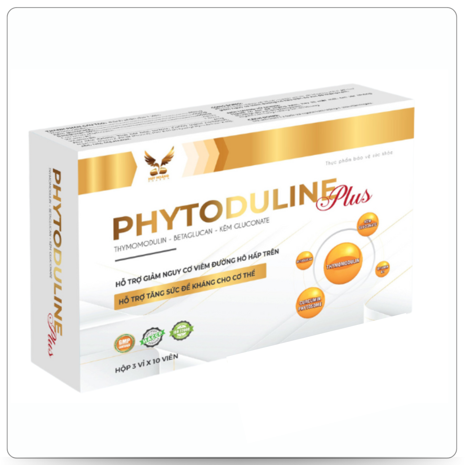 Mua tại TiktokTHÀNH PHẦN Thymomodulin: 80mg Kẽm gluconate (Kẽm 7,14mg): 50mg Betaglucan 80%: Curcumin phytosome: Vitamin B6 (Pyridoxin hydroclorid): Vitamin B1 (Thiamin hydroclorid): 1,5mg CÔNG DỤNG Hỗ trợ tăng cường sức đề kháng cho cơ thể Hỗ trợ giảm nguy cơ viêm đường hô hấp trên ĐỐI TƯỢNG SỬ DỤNG Trẻ em trên 12 tuổi và người lớn sức đề kháng kém, người có nguy cơ viêm đường hô hấp trên CÁCH DÙNG Trẻ em trên 12 tuổi và người lớn : Uống 1 viên/lần/ngày Chú ý: Thực phẩm này không phải là thuốc và không có tác dụng thay thế thuốc chữa bệnh. Không dùng cho người mẫn cảm, kiêng kỵ với bất kỳ thành phần nào của sản phẩm. Người sử dụng thuốc, phụ nữ có thai tham khảo ý kiến bác sĩ trước khi dùng