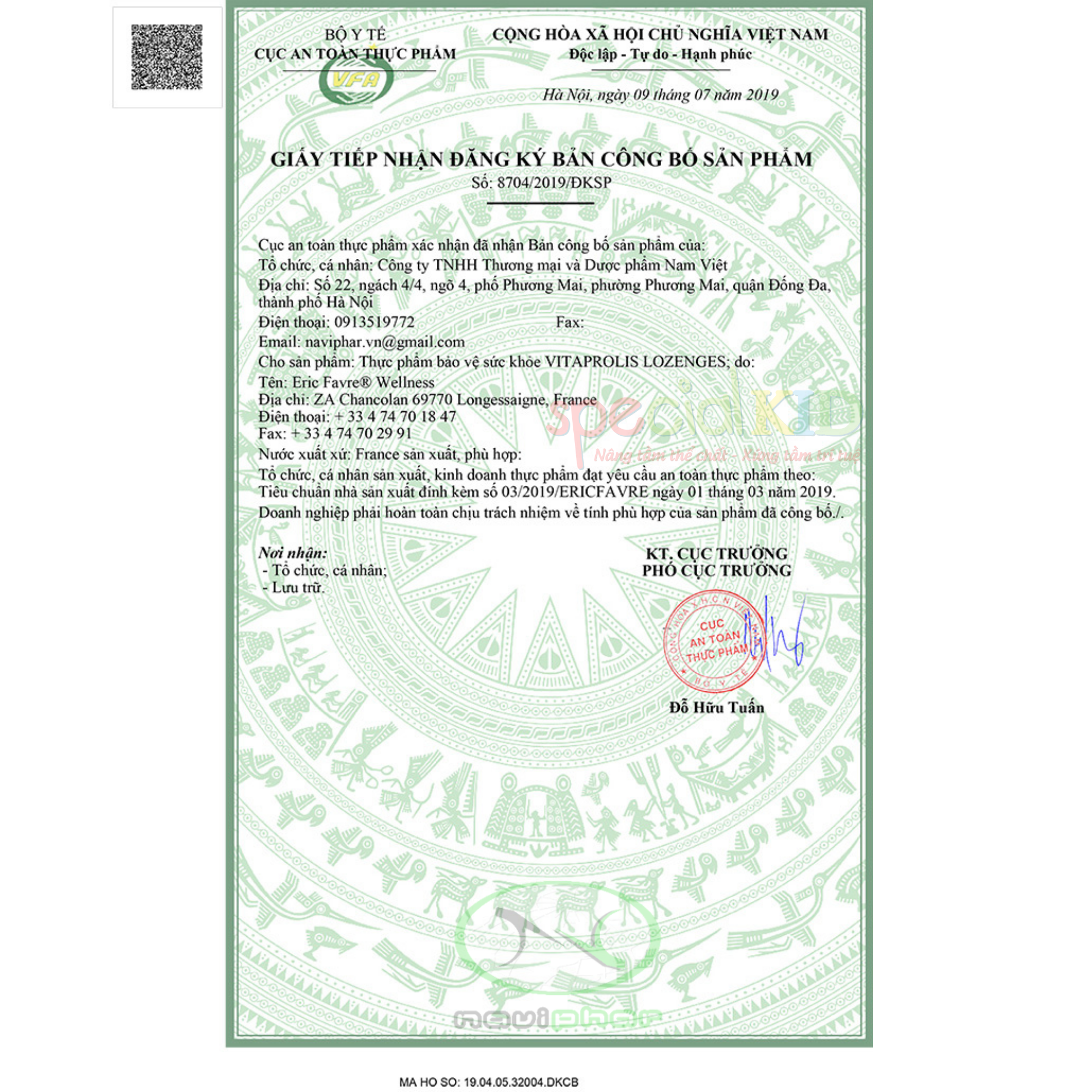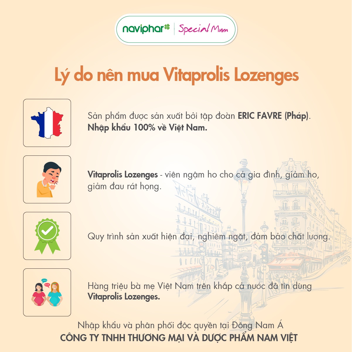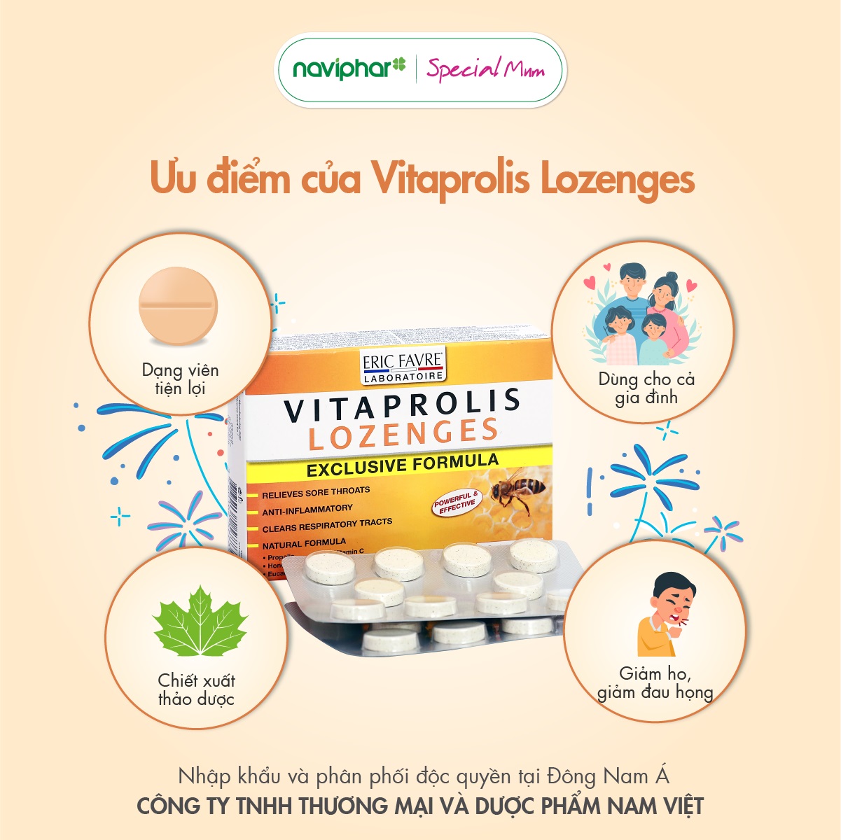 Vitaprolis Lozenges là viên ngậm ho từ tự nhiên được nhập khẩu nguyên hộp từ tập đoàn ERIC FAVRE – PHÁP danh tiếng. Vitaprolis Lozenges - viên ngậm ho cho cả gia đình. An toàn cho mẹ bầu, mẹ đang cho con bú