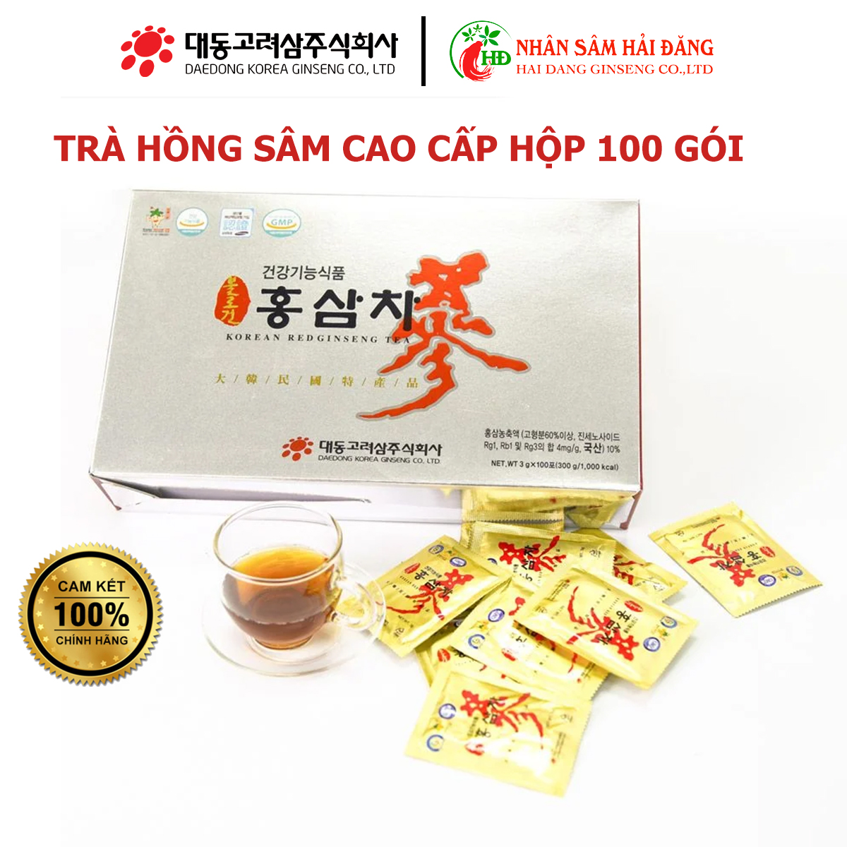 Trà Hồng Sâm Daedong Korean Red Ginseng Tea được sản xuất với nguyên liệu chính là hồng sâm Hàn Quốc 6 tuổi, đã được chọn lọc nghiêm ngặt và tinh luyện dựa trên công nghệ tiên tiến. Trà Hồng Sâm Daedong thích hợp với những người già thích uống trả giúp tăng cường sức khỏe, người làm văn phòng muốn giảm căng thẳng mệt mỏi, đặc biệt sản phẩm còn giúp hỗ trợ tăng cường sức khỏe, cải thiện trí nhớ…
