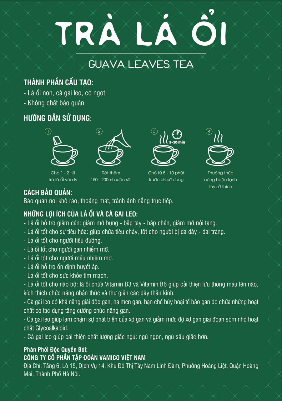 - THÀNH PHẦN CỦA TRÀ LÁ ỔI Nguồn nguyên liệu thiên nhiên được tuyển chọn khắt khe. Nguyên chất từ đọt ổi non và lá ổi.