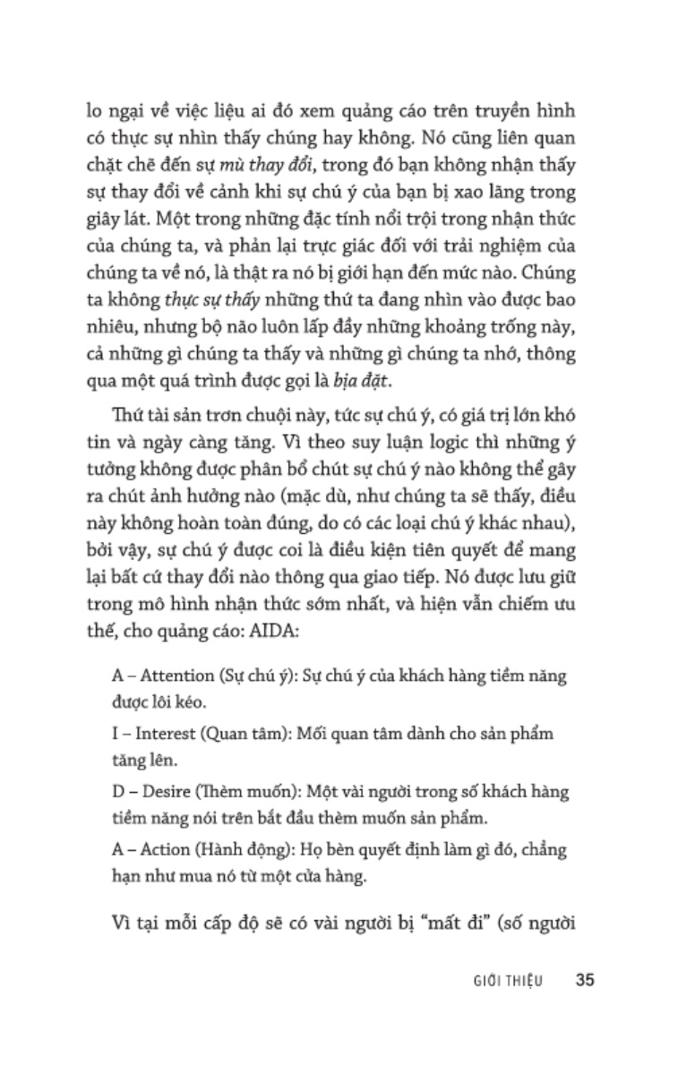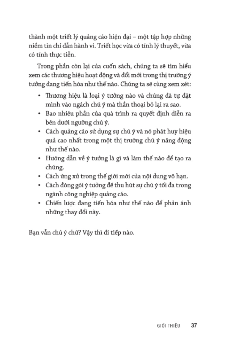 Trả phí mua sự chú ý khám phá cách những ý tưởng làm lay động tâm can con người, cũng như những thay đổi cần thiết trong quảng cáo để có thể theo kịp bối cảnh truyền thông hiện đại. Cuốn sách cũng bao gồm nhiều ví dụ thực tế từ các chiến dịch lớn của những công ty như S, Redbull và HP, cùng những công cụ và biểu mẫu marketing có tính ứng dụng cao .