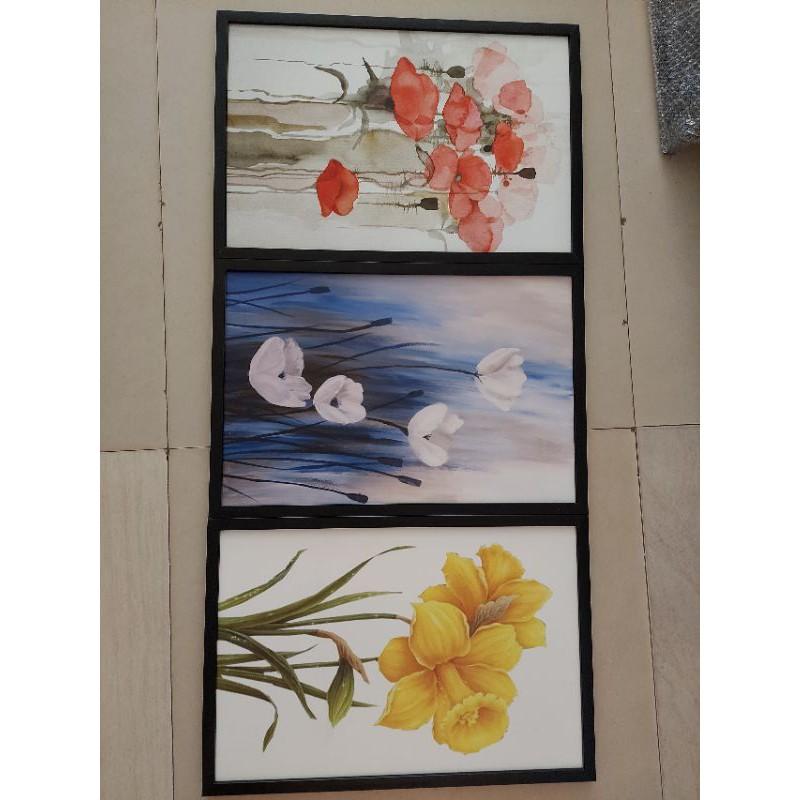 Tranh in trên vải canvas hội họa Kích thước: 40x60cm x3 Tấm lưng bằng gỗ MDF nhập khẩu. Khung vật liệu composite. Không bị ảnh hưởng bởi nước, ẩm mốc. Tặng kèm đinh 3 chân