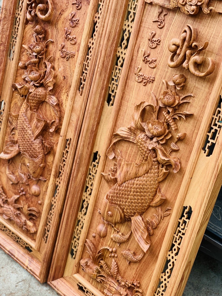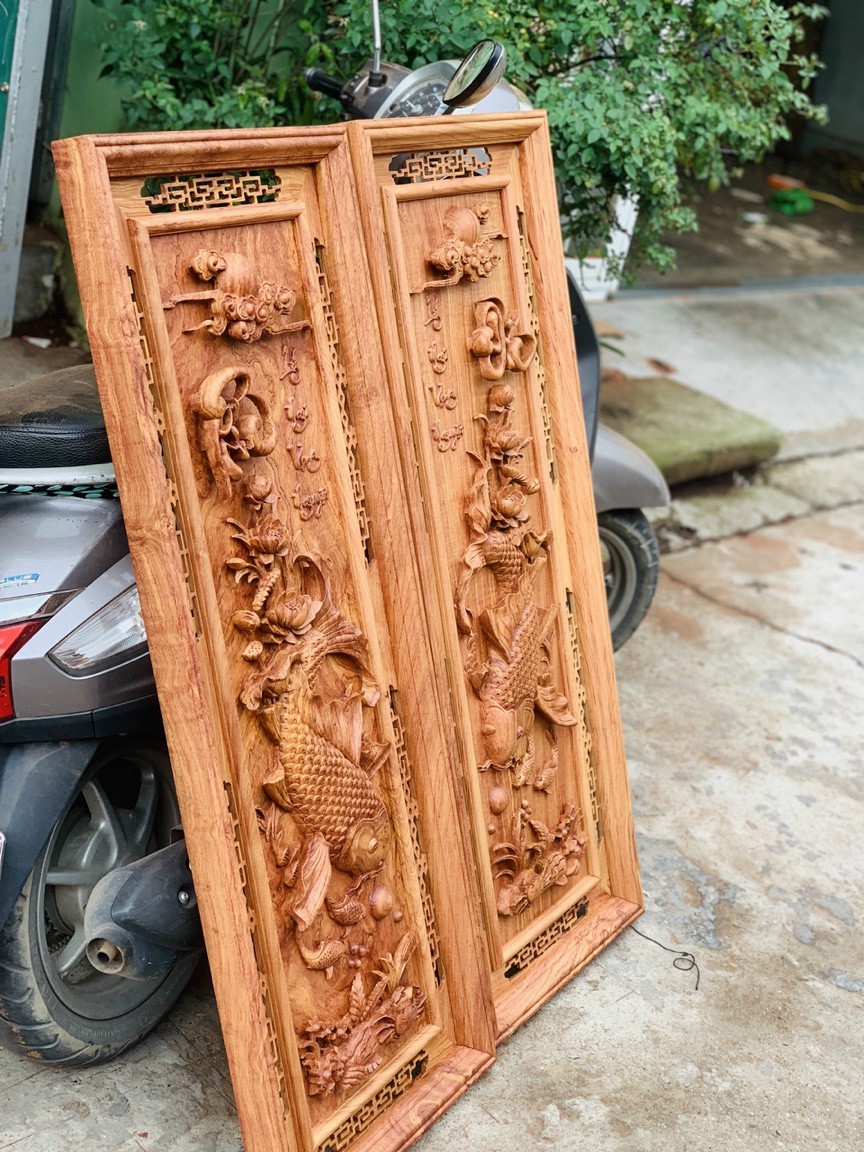 Tranh điêu khắc lý ngư vọng nguyệt được làm bằng chất liệu gỗ hương đá tự nhiên 100%  kích thước 42×117×5cm _ Tranh điêu khắc lý  ngư vọng nguyệt được trạm khắc vô cùng tỉ mỉ ,tinh sảo kỳ công .Đi hầu hết tất cả mọi chi tiết góc ngách ,nội dung hoa văn của tranh đều được gọt tỉa chỉnh sửa hoàn toàn bằng tay thủ công .Đồng thời tranh được kiểm định kỹ lưỡng khắt khe ,Như cho vào thẩm sấy cho gỗ khô kiệt .Mục đích trống dập nứt vênh mo mối mọt ,Kết hợp với trà nhám đánh giấy giáp nhiều nước sờ mát lạnh ,Rồi cho vào phun lót làm bóng mờ để giữ lại mầu sắc vân gỗ tự nhiên ,Cặp tranh được làm và hoàn thiện do bàn tay khối óc tài hoa ,Từ những người thợ giàu kinh nghiệm ,Cũng như tay nghề cao trong làng nghề  truyền thống .Chính vì thế cặp lý ngư vọng nguyệt đã đáp ứng đầy đủ mọi tiu trí ( Đẹp bền rẻ ) Thẩm mỹ nghệ thuật với chất lượng tuyệt vời