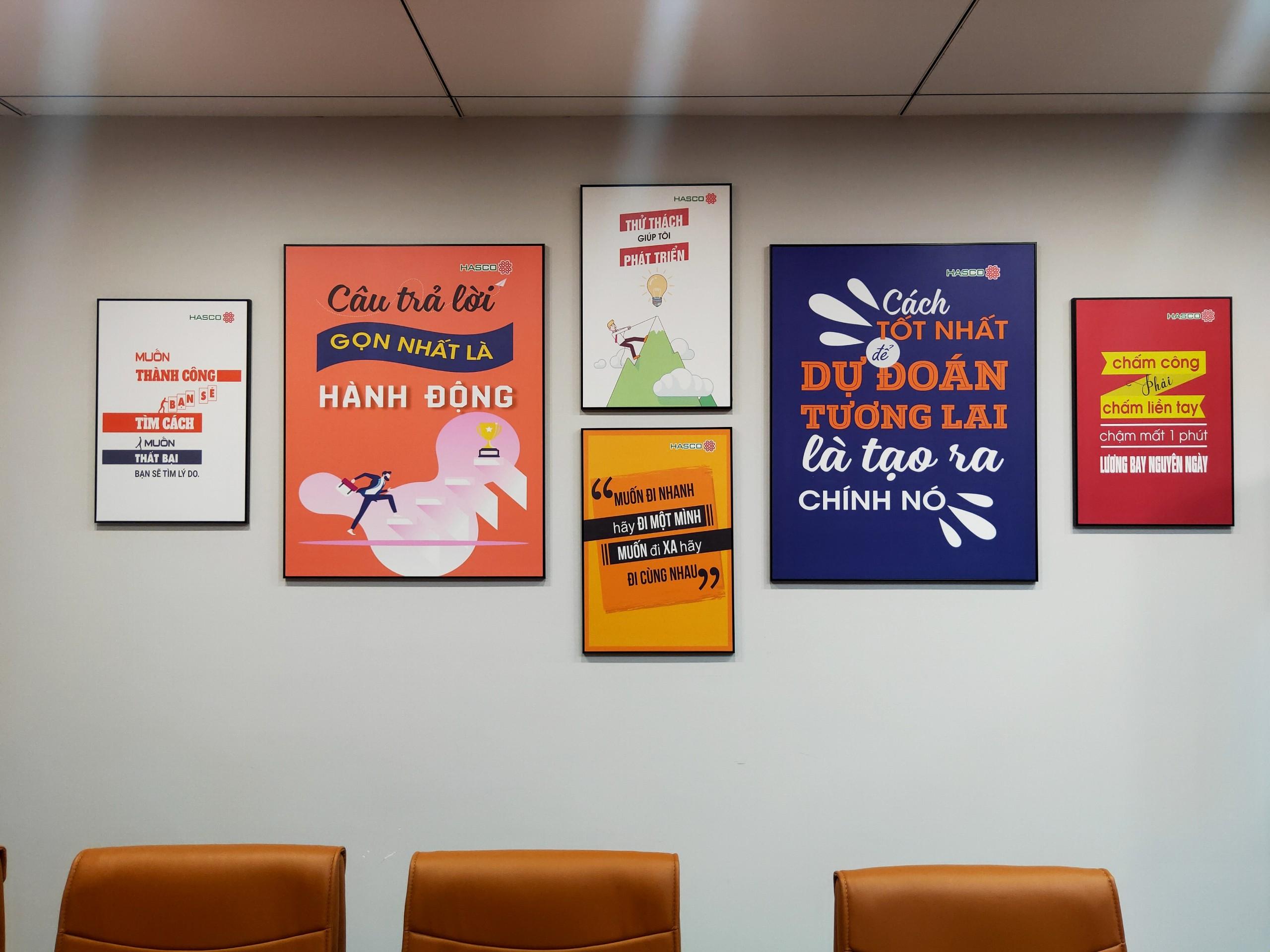 - Độ bền màu lên đến hàng chục năm vẫn như mới. Tranh động lực khung viền sang trọng: Trong những không gian cần có sự trang trọng hơn thì tranh slogan được đóng khung là một trong các lựa chọn tối ưu. Ngoài cấu tạo mặt tranh giống như tranh động lực tràn viền ra còn có khung composite 2cm, mặt hiển thị 0.5cm tạo cảm giác sang trọng hơn. Hình ảnh thực tế tranh slogan động lực có khung viền Lưu ý khi sử dụng: