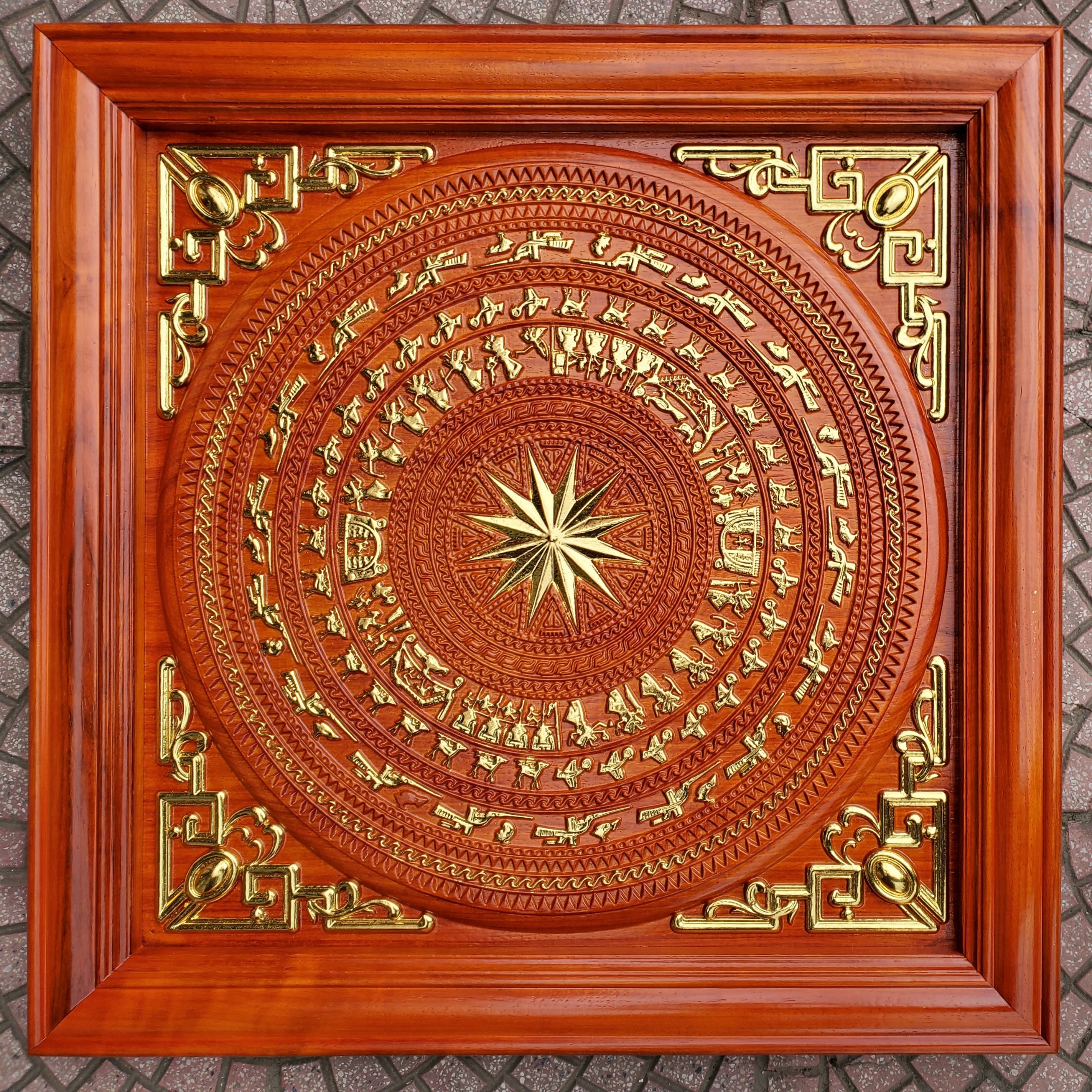 Tranh gỗ hương đục nổi mạ vàng - tranh trống đồng Chất liệu gỗ hương liền khổi đục nổi cực tinh xảo, mạ vàng sơn pu cao cấp Gỗ lục lạc , không cong vênh lứt vỡ. Kích thước dày 5cm81cm81cm