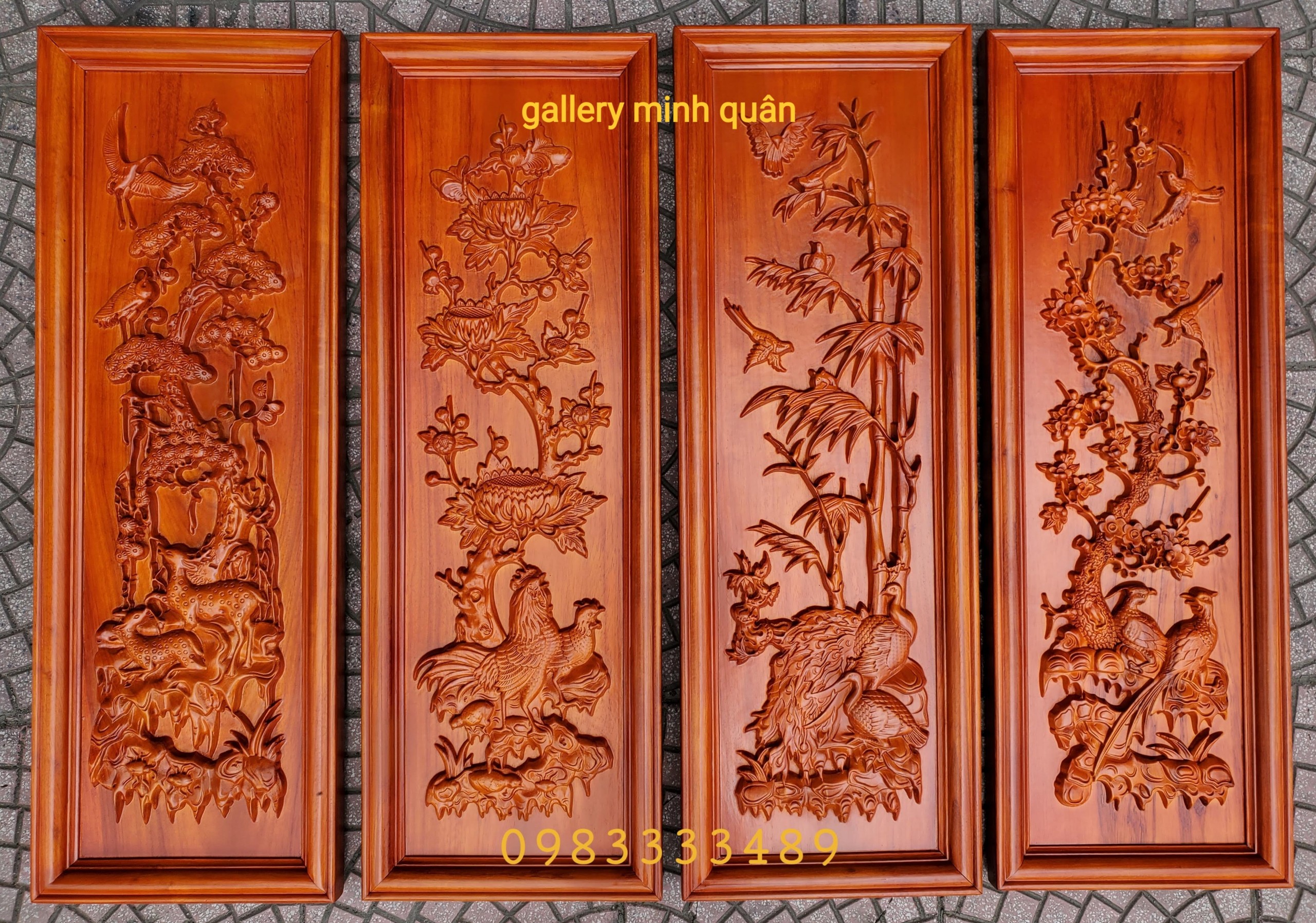 Tranh tứ quý tùng cúc trúc mai đục nổi gỗ hương huyết cao cấp-Giá Rẻ-0902328432
