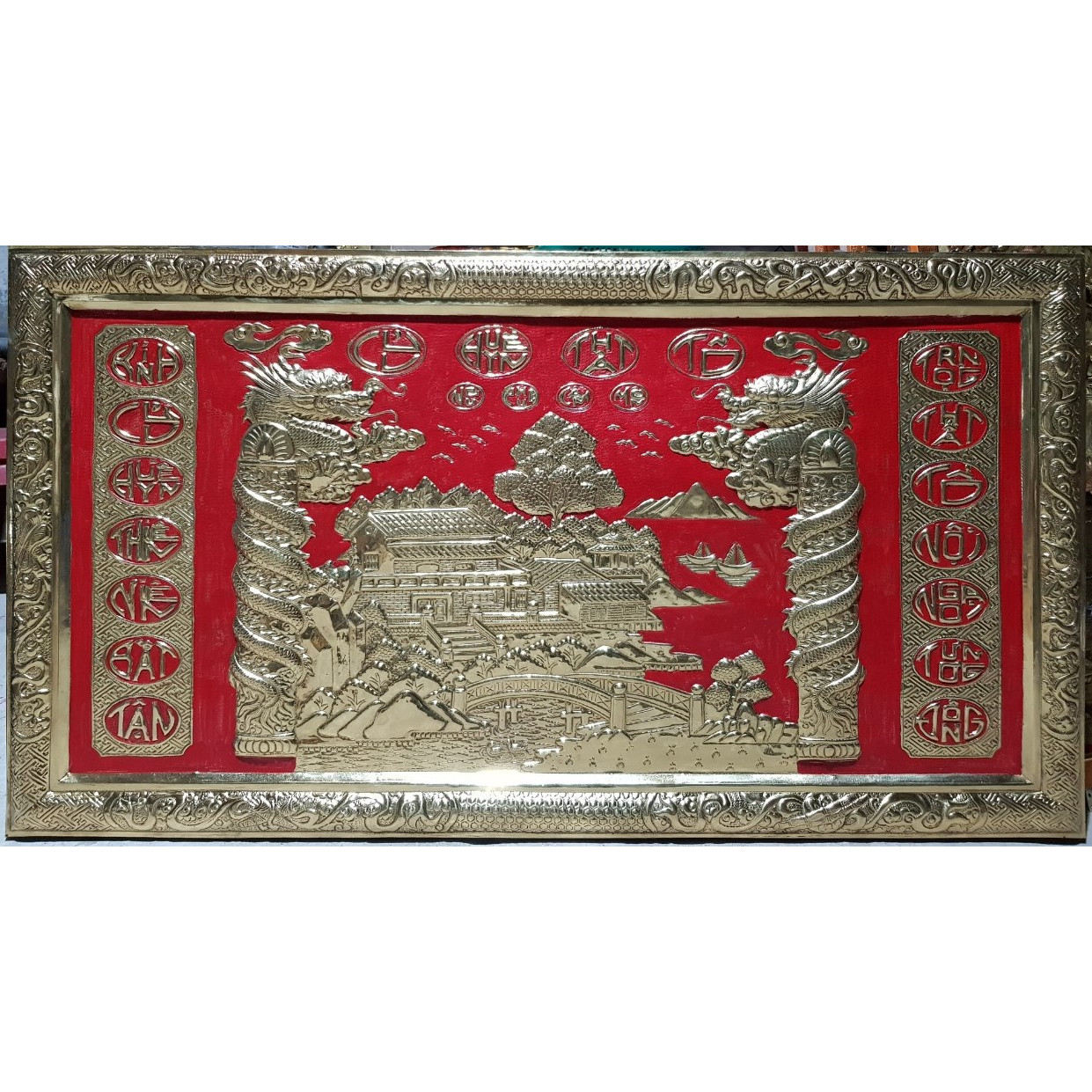 Mua tại TiktokTranh liễn thờ tổ tiên. CỬU -HUYỀN – THẤT- TỔ (thờ 9 đời nội ngoại) Sản phẩm được chế tác thủ công rất tinh xảo từ đồng vàng nguyên chất, liền tấm tranh và khung bằng đồng . Kích thước phủ khung 76*139cm